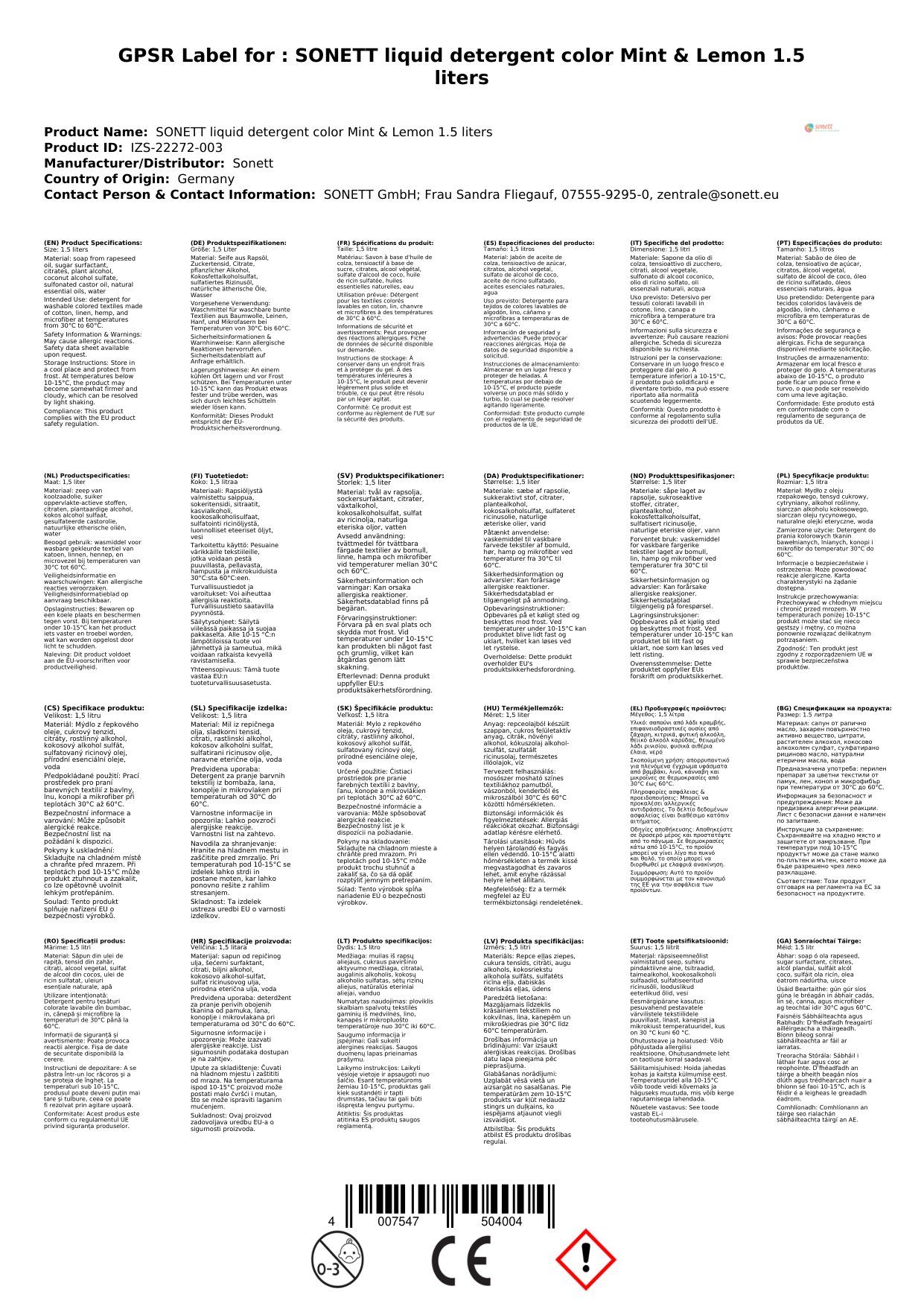 Cuir ceist chun níos mó a fhoghlaim faoin táirgeGlantach dathanna, glantach leachtach, cumhráin mint agus líomóid, 1.5 Liter