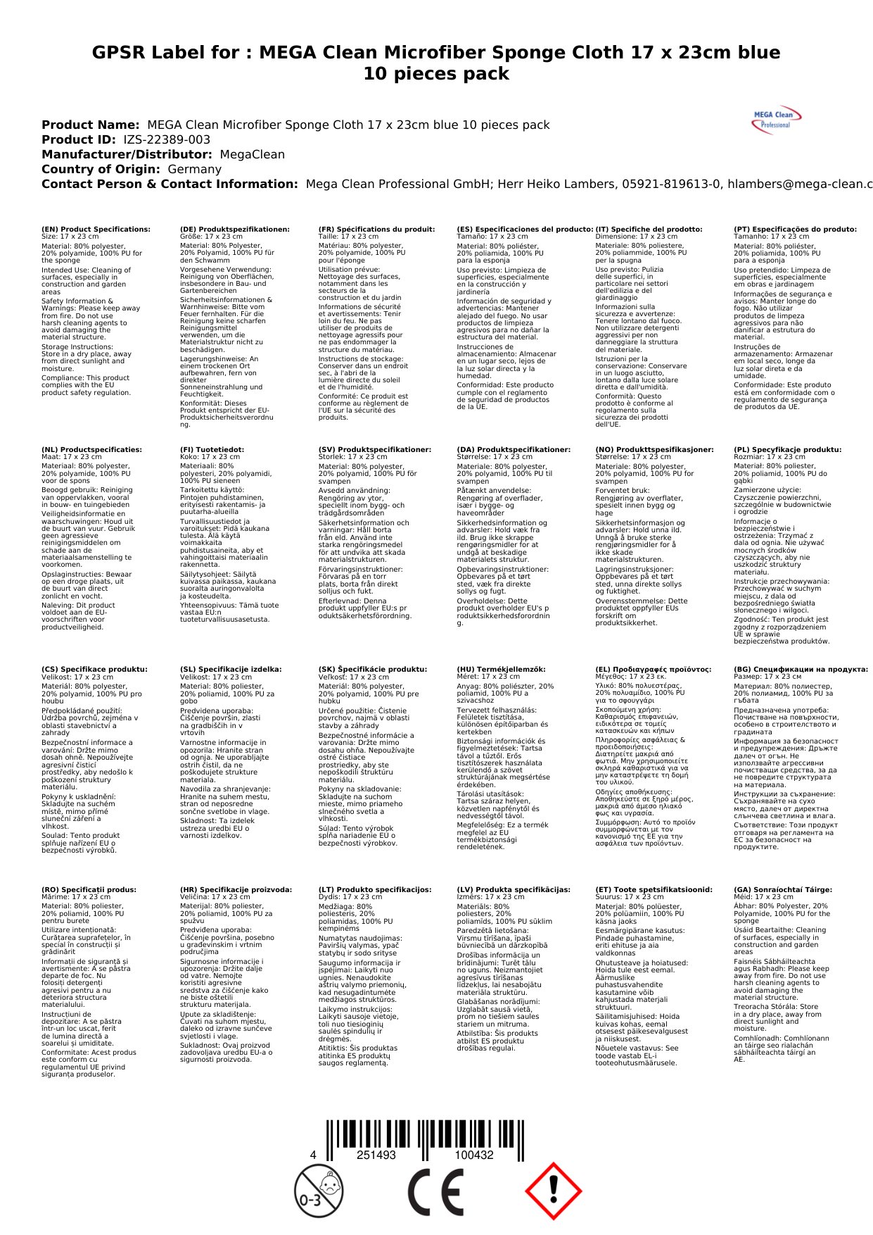 - Méid Foirfe (17 x 23 cm): Tá an méid seo oiriúnach le haghaidh tascanna glantacháin éagsúla timpeall an tí, ag soláthar solúbthachta i nglanadh dromchlaí éagsúla.