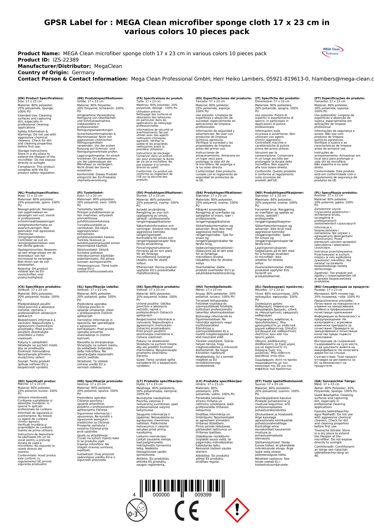 Cuir ceist chun níos mó a fhoghlaim faoin táirgeÉadach microfiber, Pacáiste 10 n-éadach, 17 x 23 cm, Éadaí glantacháin microfiber
