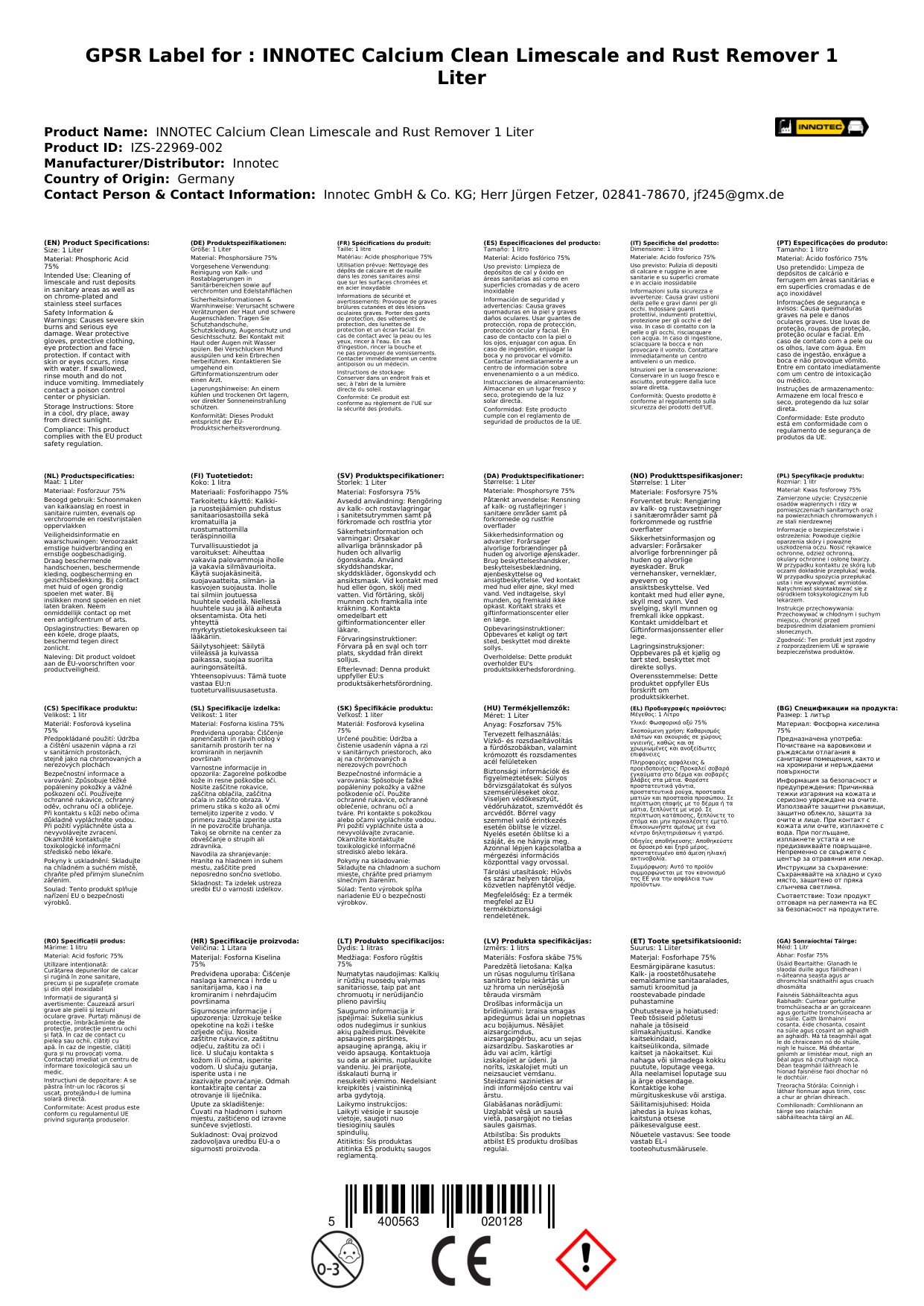 Tá Innotec Calcium Clean deartha chun aolchloch, meirge agus smál crua eile a bhaint go héifeachtach. Tá sé oiriúnach le húsáid ar thíleanna, crua-earraí, agus dromchlaí eile sa seomra folctha agus sa chistin. Leis an bhfoirmle láidir seo, is féidir leat dromchlaí a ghlanadh go tapa agus go héasca, ag fágáil orthu glan agus lonrach. Is táirge riachtanach é seo do gach teach.