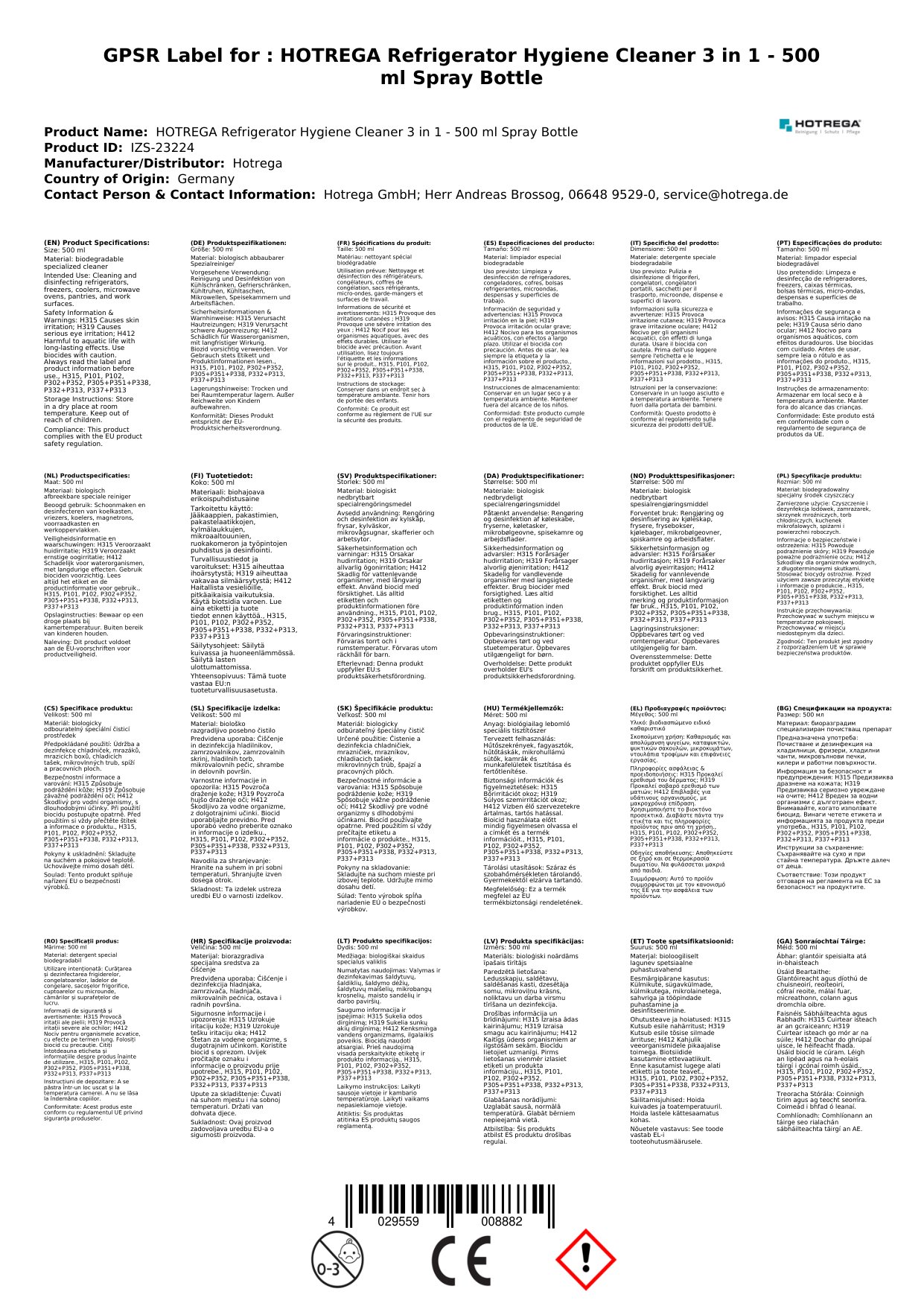 Cinntíonn ár spraeire glantach cuisneora úire agus glaineacht i do chuisneoir. Leis an bhfoirmle speisialta 3 in 1, glanann sé, díghalraíonn sé, agus cuireann sé boladh úr ar do chuisneoir. Tá an buidéal spraeire 500 ml éasca le húsáid agus cuireann sé go leor glantach le haghaidh úsáide iolra. Tá sé sábháilte le húsáid in aice le bia, ag cinntiú sláinte agus sábháilteacht do theaghlaigh.