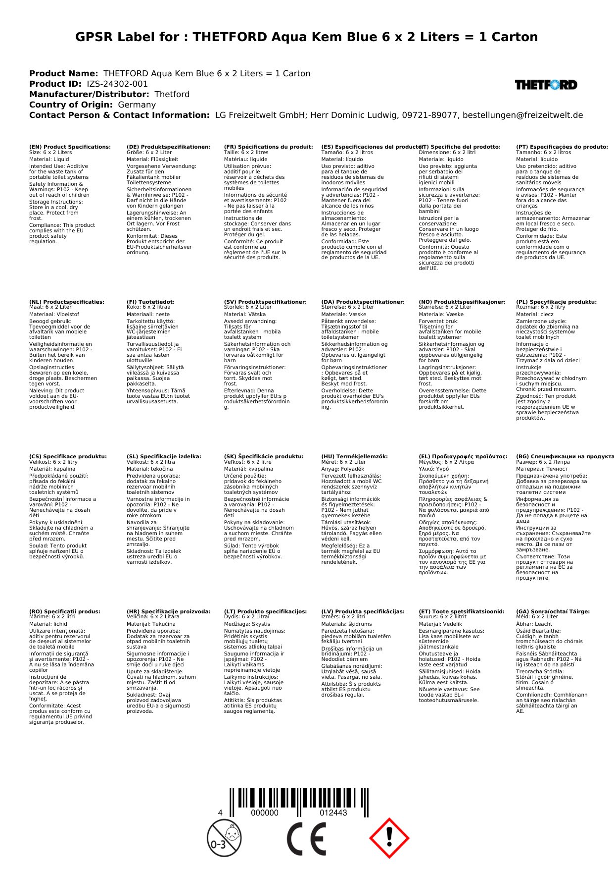 Áirítear sa chartán seo sé bhuidéal 2-lítear d’Aqua Kem Blue, an leacht leithris is fearr le haghaidh leithris iniompartha. Tá an fhoirmle seo deartha chun bolaithe a rialú, dramhaíl a bhriseadh síos, agus sláinteachas a choinneáil. Is féidir leat a bheith cinnte go mbeidh do leithreas iniompartha glan agus úr, rud a chiallaíonn eispéireas níos taitneamhaí duit féin agus do do theaghlach.