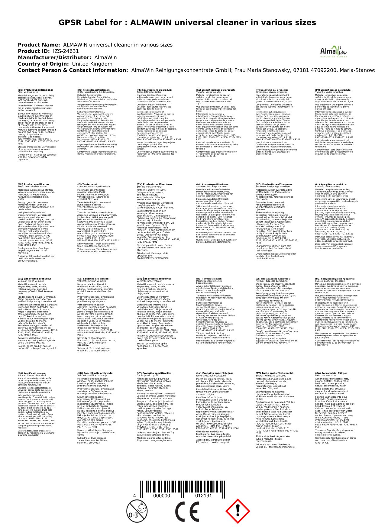 Ár nglantóir tí nádúrtha Almawin, rogha iontach le haghaidh glantacháin sábháilte agus éifeachtach. Tá sé oiriúnach do gach dromchla sa teach agus tá sé éiceolaíoch. Tá sé ar fáil i méideanna éagsúla chun freastal ar do riachtanais. Is féidir leat a bheith cinnte go bhfuil tú ag úsáid táirge atá sábháilte do do theaghlach agus don chomhshaol.