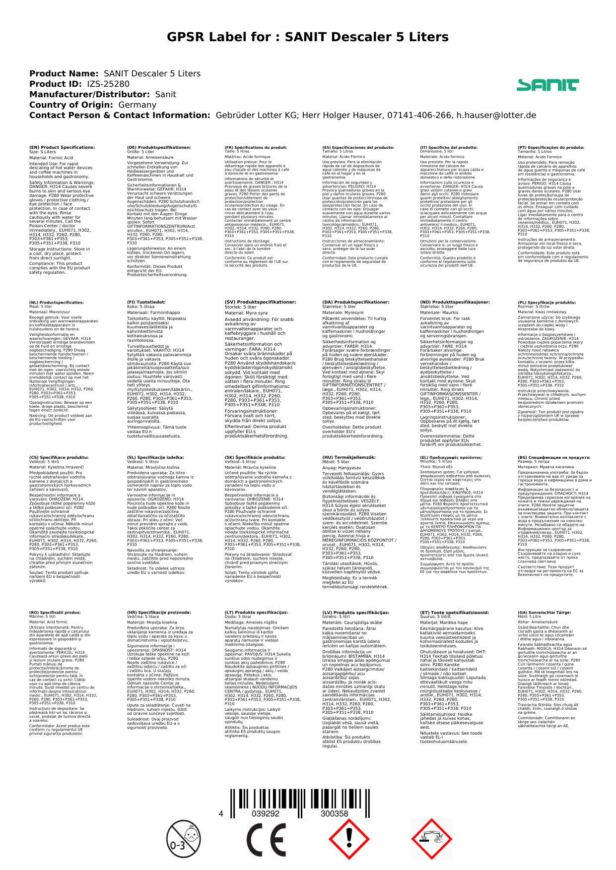 Contúirt: Aicmiú de réir VO 1272/2008: H302 – Díobhálach má shlogtar. H318 – Gortaítear na súile go dona.