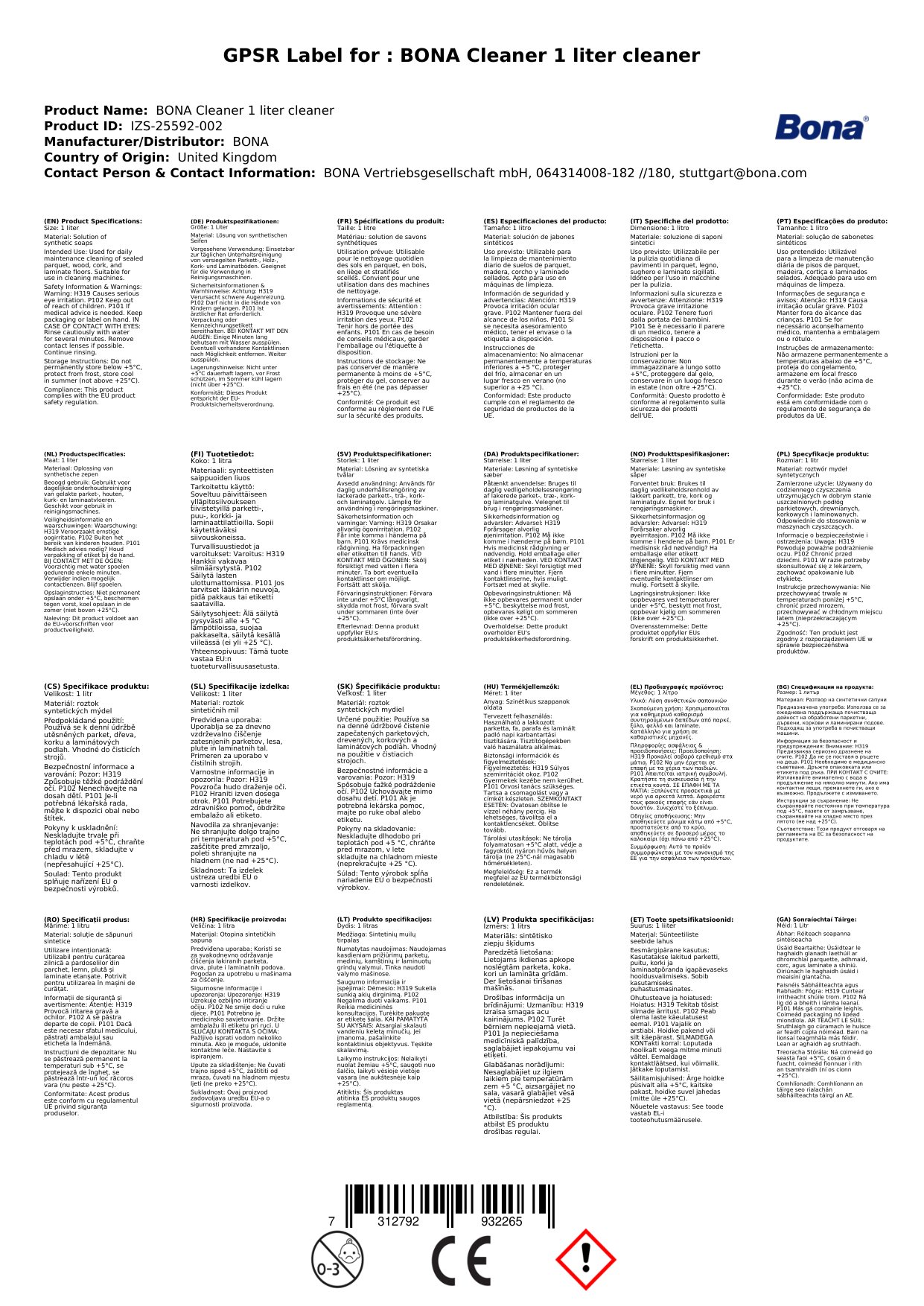 Glanadh Bona, Bona Glantóir 1 Lítear, Glantóir Urláir, 1 Lítear