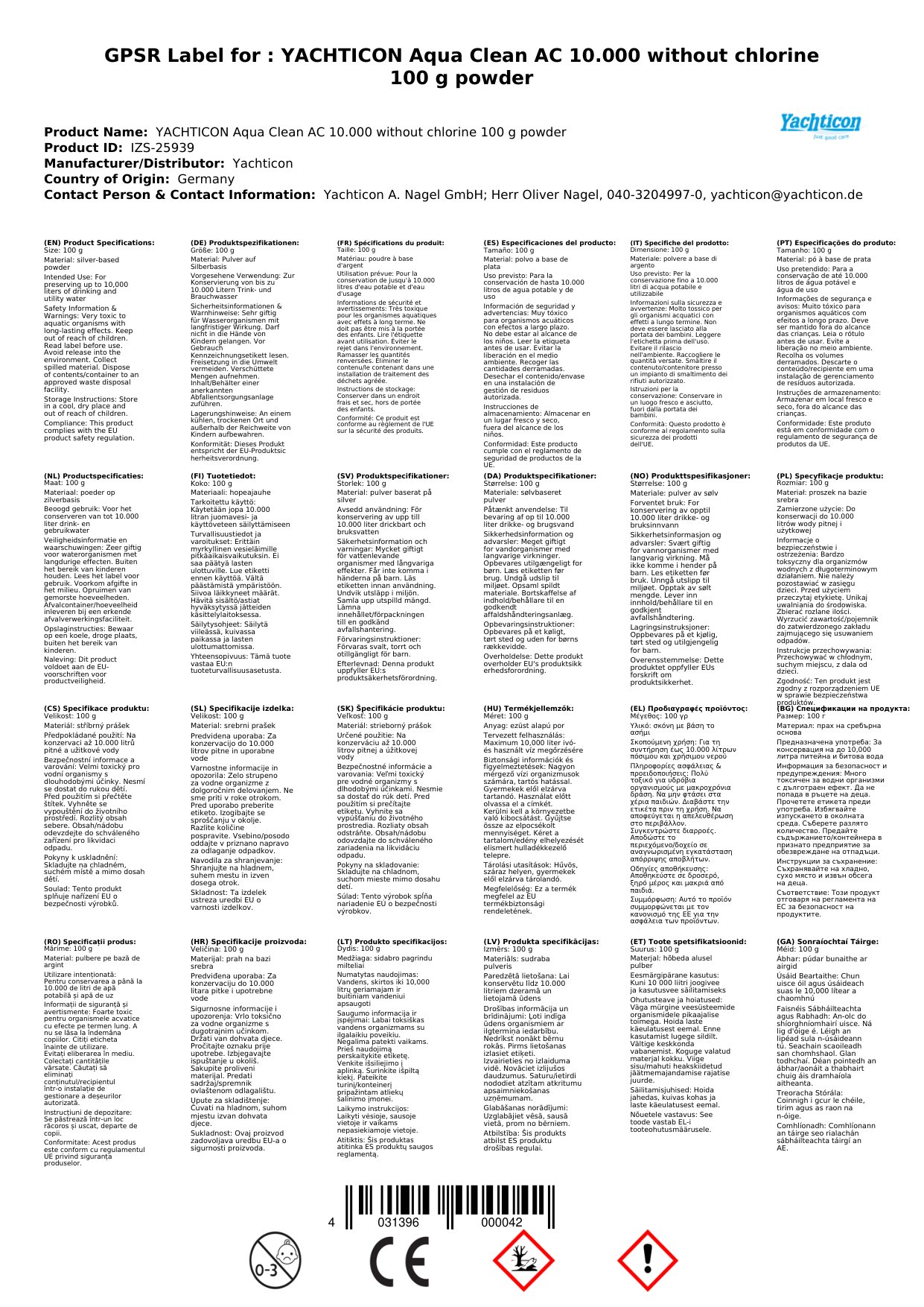 Cuir ceist chun níos mó a fhoghlaim faoin táirgeGlanadh uisce, Púdar glantacháin uisce, 100 g, Uisce slán