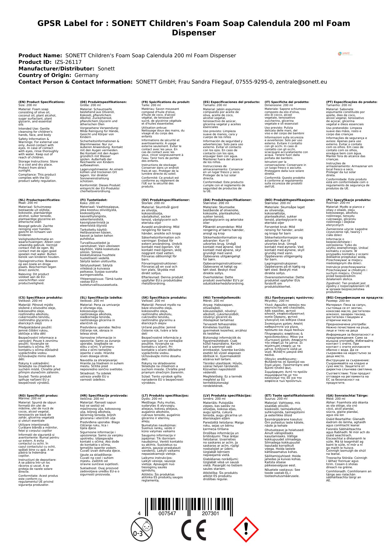 Tá ár gallún súdaí calendula speisialta deartha le haghaidh craiceann íogair do pháistí. Tá sé saor ó cheimiceáin chrua agus tá sé lán de shóchán nádúrtha calendula, ar a dtugtar mar gheall ar a airíonna soothes agus cneasaithe. Tagann sé i mbuidéal feisteoir cúr áisiúil, rud a fhágann go bhfuil sé éasca le húsáid agus spraíúil do pháistí. Tá sé foirfe le húsáid go laethúil chun craiceann do pháiste a choimeád glan, bog agus sláintiúil.