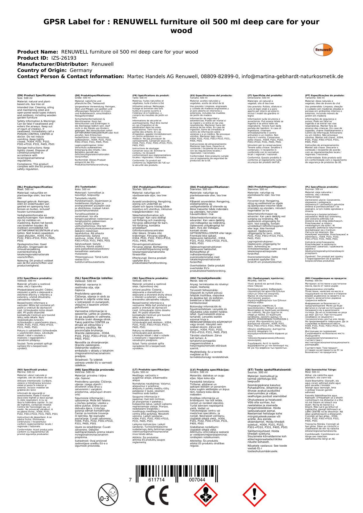 Tá an Ola Troscáin seo deartha chun cúram domhain a thabhairt d’adhmad agus chun é a chosaint. Tagann sé i mbuidéal 500 ml, rud a chinntíonn go bhfuil go leor táirge agat le húsáid ar iliomad píosaí troscáin. Tá sé oiriúnach le haghaidh cineálacha éagsúla adhmaid, ag tabhairt cuma athnuachana duit. Leis an ola seo, is féidir leat a bheith cinnte go mbeidh do throscán cosanta agus ag breathnú go hálainn ar feadh na mblianta le teacht.