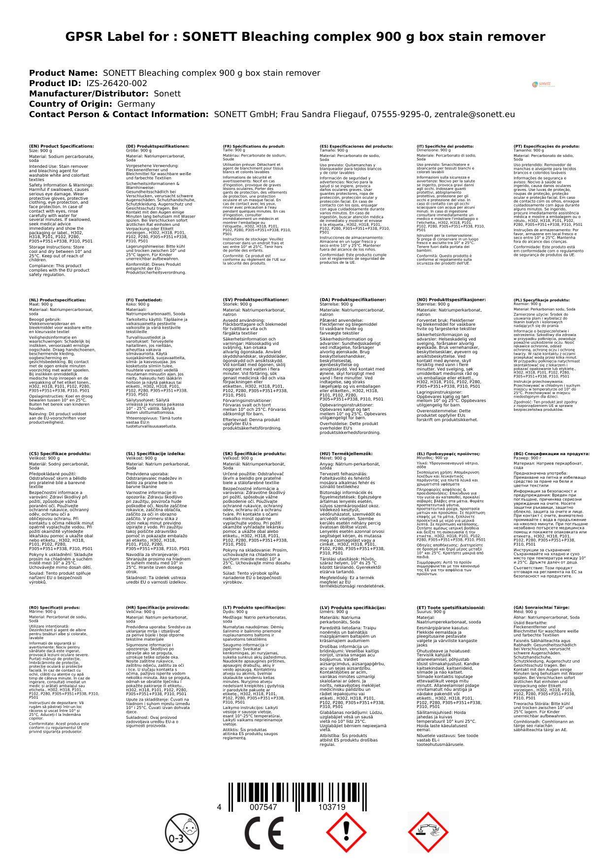 Contúirt: Aicmiú de réir VO 1272/2008: H302 - Díobhálach má shlogtar. H318 - Déanann sé damáiste tromchúiseach do na súile.