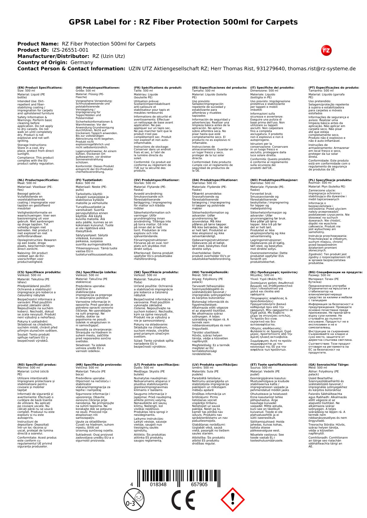 Tá ár sprae cosanta snáithín cairpéad deartha chun do chairpéad a chosaint ar stains, salachar, agus taise. Le foirmle 500ml, tá go leor ann chun cairpéad mór a chóireáil. Tá sé sábháilte le húsáid ar fhormhór na gcineálacha cairpéad agus tá sé simplí a chur i bhfeidhm. Cosnaíonn sé do infheistíocht i gcairpéid ar feadh i bhfad.
