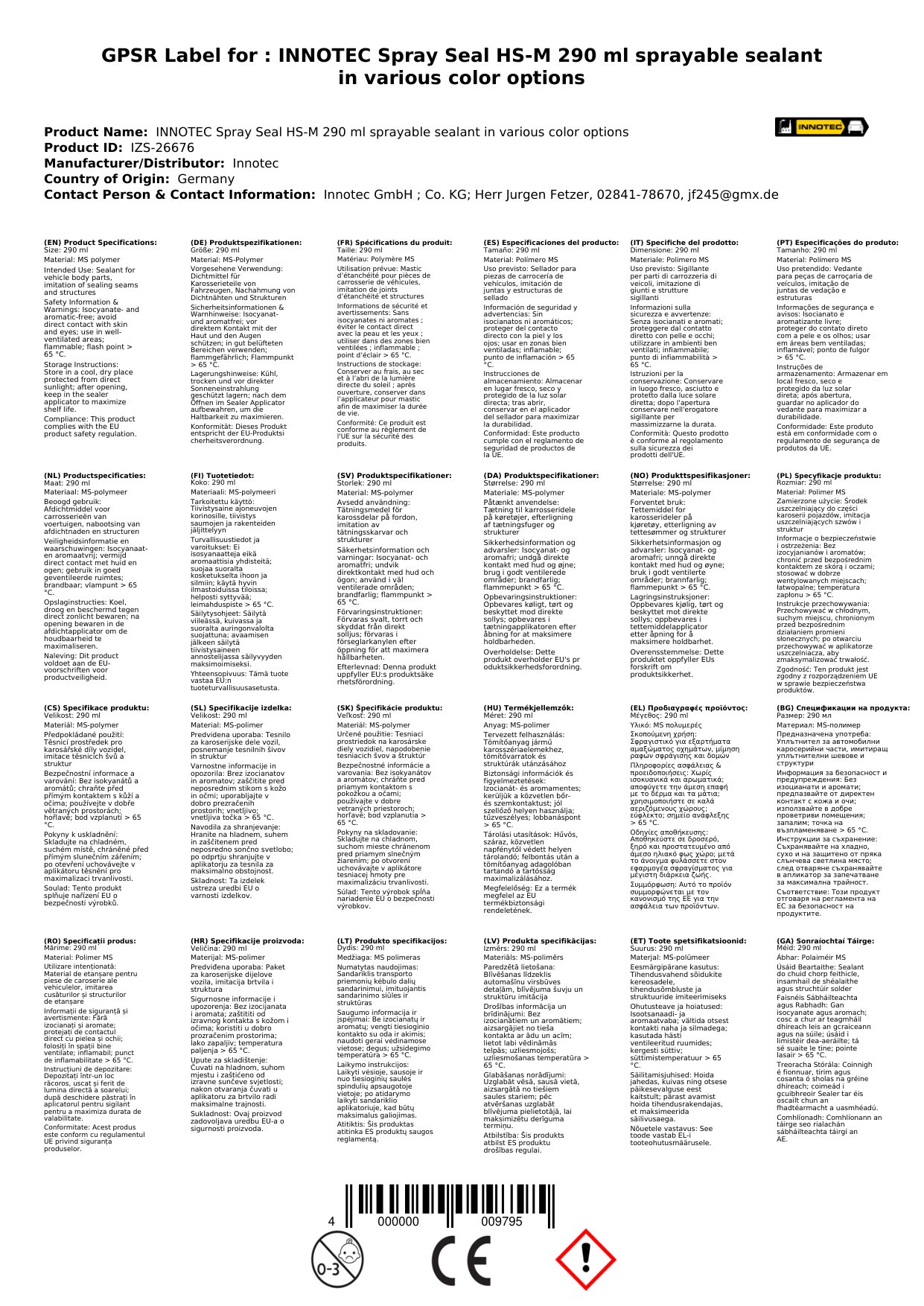 Cuir ceist chun níos mó a fhoghlaim faoin táirgeSéala Sprae Innotec, Séala HS-M, 290 ml Dúnadh Spraeála Ilfheidhmeach, Dathanna Séala Spraeála