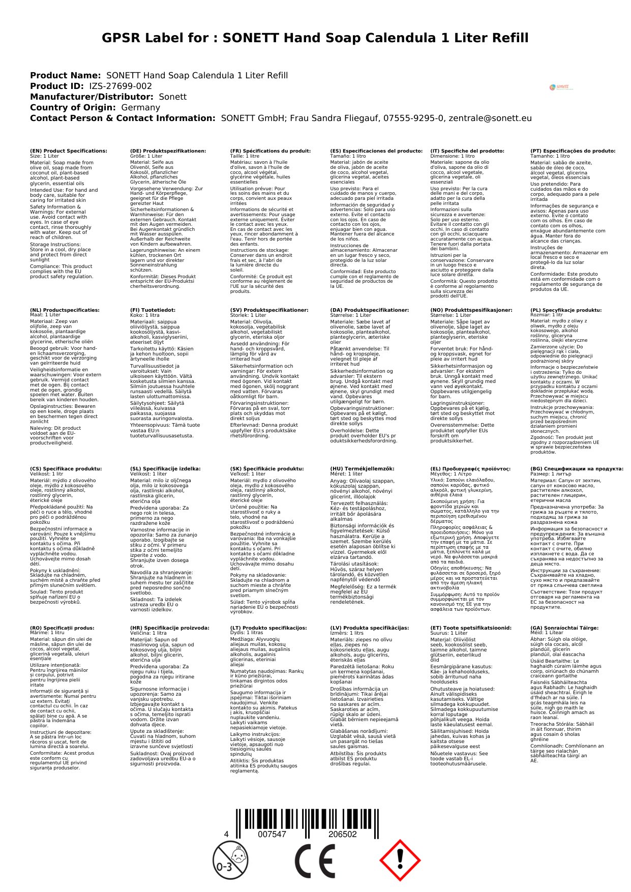 Tá ár gallúnach láimhe calendula orgánach deimhnithe agus saor ó parabens, sulfates, agus dathanna saorga. Tá sé oiriúnach do gach cineál craicinn, lena n-áirítear craiceann íogair. Leis an mbotella athlíonta 1 lítear, gheobhaidh tú luach ar airgead agus laghdóidh tú do lorg comhshaoil. Bain sult as gallúnach nádúrtha a chothaíonn agus a ghlanann do lámha go héifeachtach. Cén fáth go bhfuil sé seo tábhachtach duit: Gheobhaidh tú táirge sábháilte, éifeachtach agus cairdiúil don chomhshaol a thugann aire do do lámha.