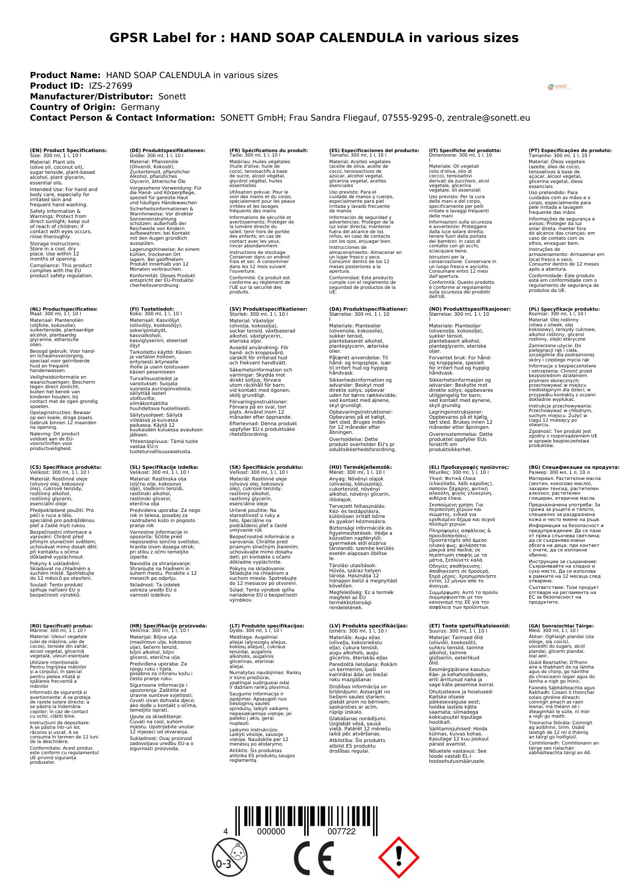 Tá ár gallúnach láimhe calendula deartha go speisialta do lámha íogaire. Déantar é le comhábhair nádúrtha orgánacha, cosúil le ola calendula, atá ar eolas mar gheall ar a n-airíonna soothing. Tá sé saor ó cheimiceáin chrua, rud a fhágann go bhfuil sé foirfe do gach cineál craiceann. Tá sé ar fáil i méideanna éagsúla chun freastal ar do chuid riachtanas.