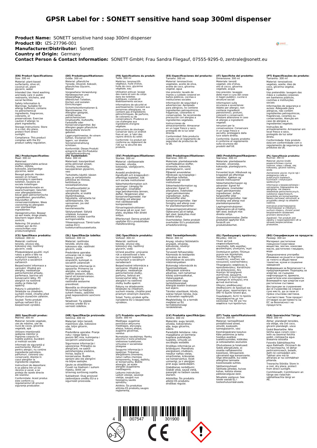 Gallúnach láimhe íogair, Spender 300ml, Gallúnach láimhe, Gallúnach nádúrtha