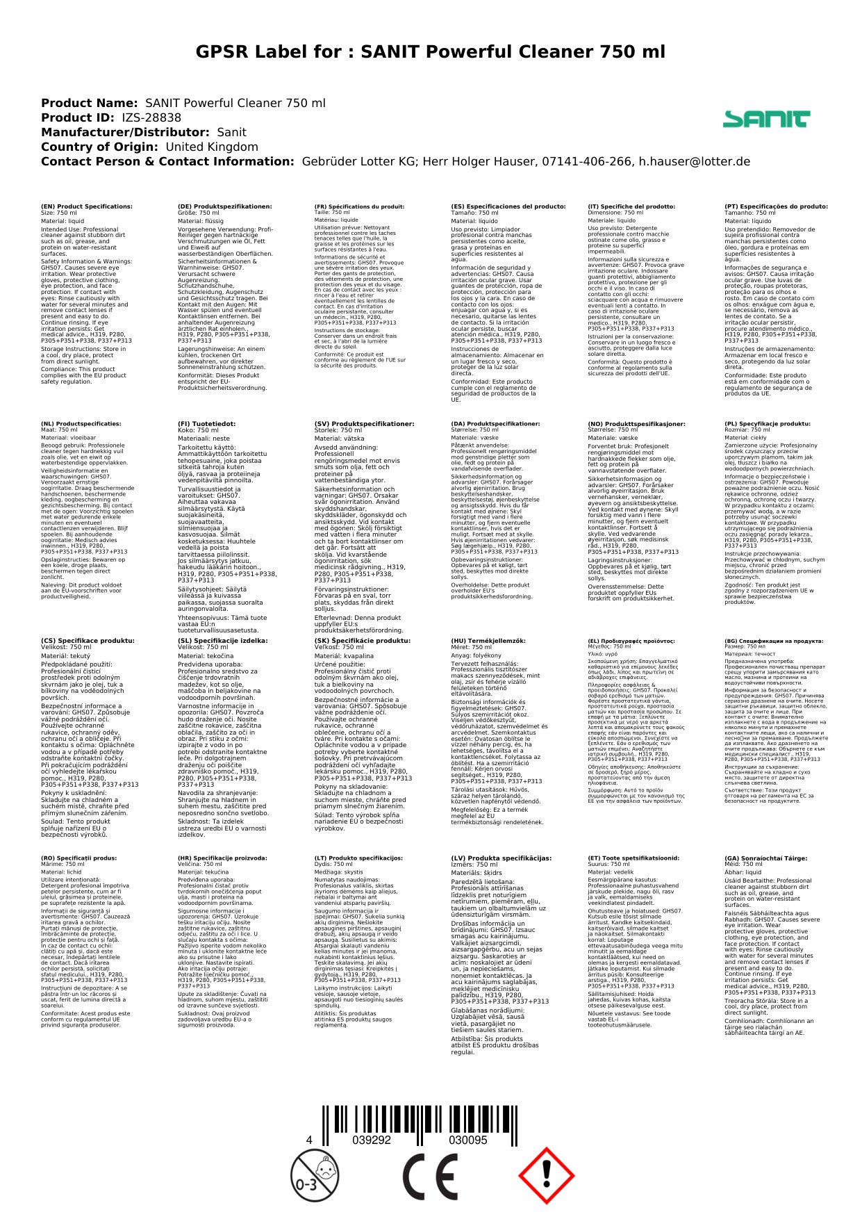 Tá ár nglanadh láidir tí deartha chun dul i ngleic le gach cineál salachair agus grime. Leis an bhfoirmle láidir seo, is féidir leat dromchlaí éagsúla a ghlanadh go héasca, ón seomra folctha go dtí an chistin. Cuireann an spraeire áisiúil ar do chumas an táirge a chur i bhfeidhm go díreach ar an limistéar atá le glanadh, ag sábháil am agus iarracht duit. Tá an buidéal 750 ml foirfe do riachtanais glantacháin rialta sa bhaile.