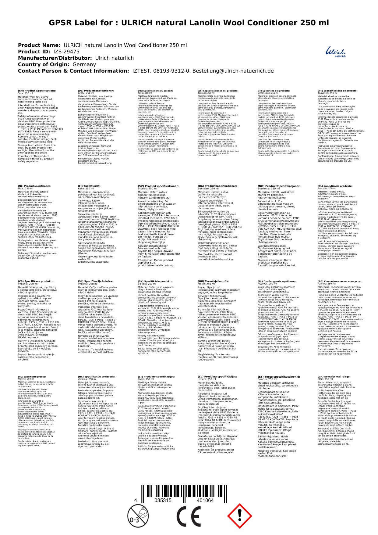 Tá an Ollspülung lanolin, Spülung olann seo deartha go speisialta chun cúram a thabhairt d'olann. Tá sé saibhrithe le lanolin nádúrtha, a athlíonann olaí riachtanacha ar ais i snáithíní olann. Tá an spülung olann seo foirfe chun do chuid olann a níochán de láimh agus sa mheaisín. Cuirfidh sé seo ar ais na holaí nádúrtha, ag coinneáil an olann bog agus supple.