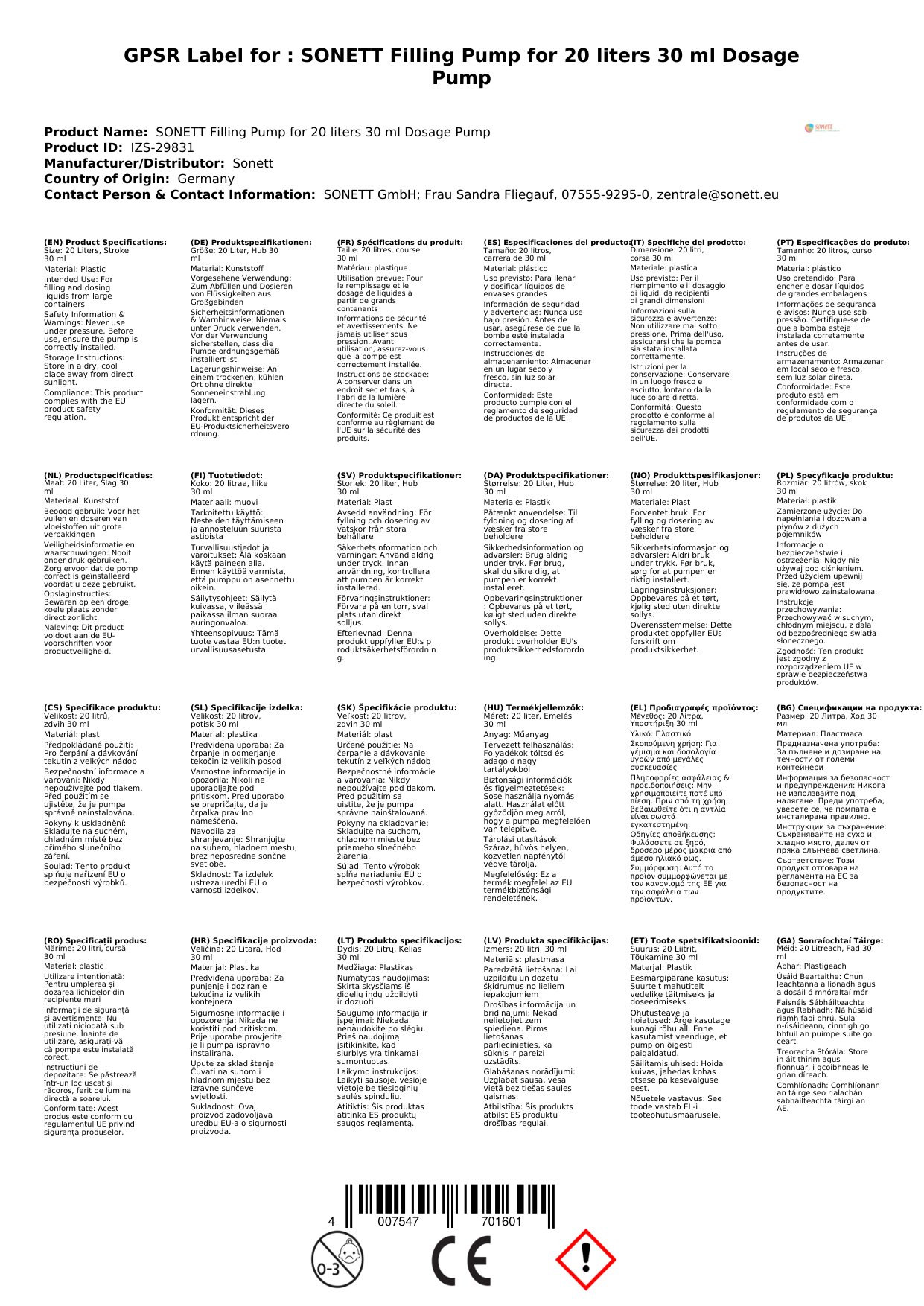 Tá an caidéal líonta 20 lítear agus an caidéal dáileog 30 ml deartha chun leachtanna a láimhseáil go cruinn. Le ráta sreafa 30 ml in aghaidh an bhuille, is féidir leat an méid leachta a theastaíonn uait a rialú go héasca. Tá an caidéal seo oiriúnach le húsáid le coimeádáin suas le 20 lítear. Is féidir leat a bheith ag brath ar uirlis atá deartha le haghaidh marthanacht agus éifeachtúlachta.