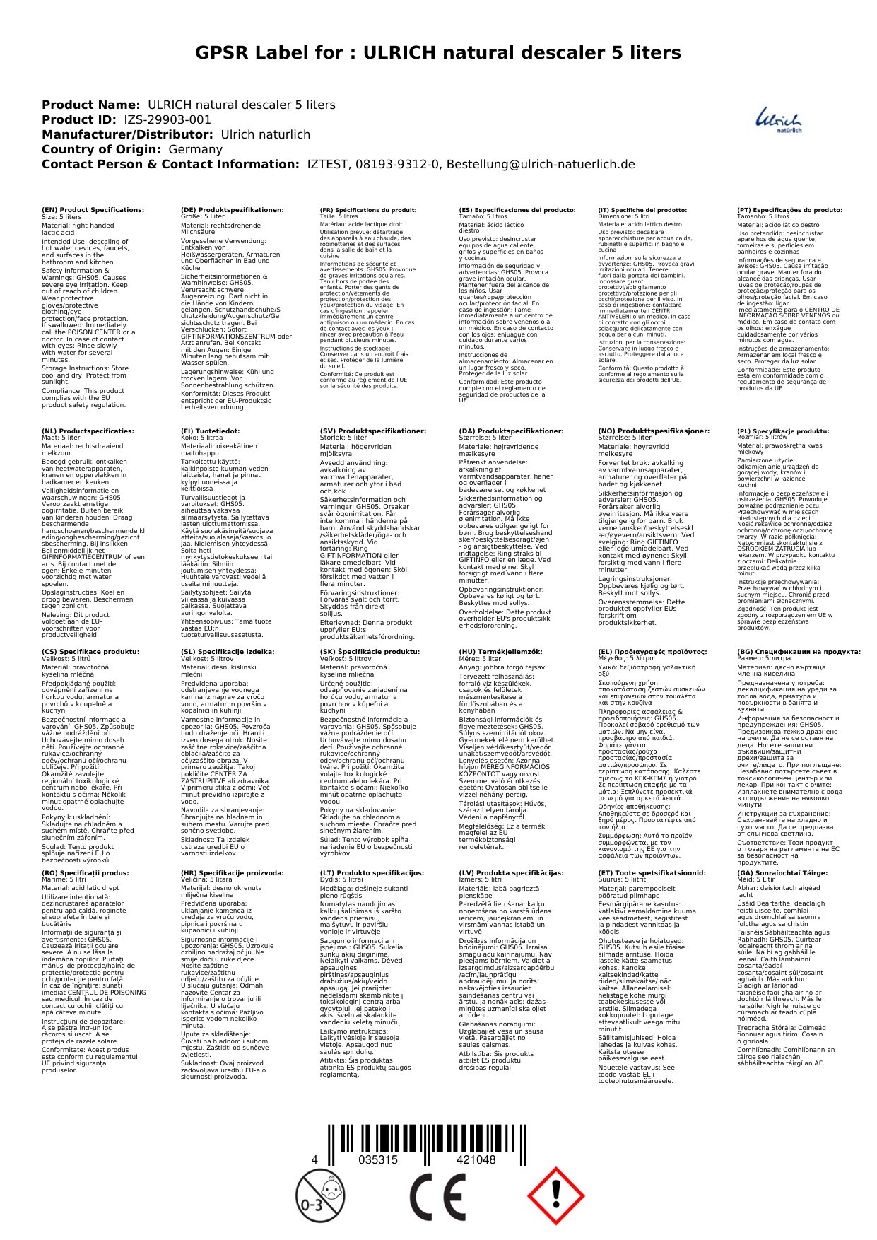 Is díscalcaire nádúrtha é seo atá foirfe do dhaoine atá ag lorg bealach éifeachtach agus sábháilte chun taiscí aoil a bhaint. Tagann sé i gcoimeádán 5 lítear, atá an-oiriúnach le húsáid sa bhaile. Tá an táirge seo an-éifeachtach le húsáid ar faucets, téitheoirí uisce, agus caife. Is é an rud a fhágann go bhfuil sé chomh maith sin ná a fhoirmle nádúrtha, a chiallaíonn go bhfuil sé sábháilte do dhaoine, do pheataí agus don timpeallacht. Déanann sé seo an rogha iontach do theaghlaigh atá feasach ar an gcomhshaol. Leis an díscalcaire seo, is féidir leat a bheith cinnte go bhfuil tú ag úsáid táirge atá éifeachtach agus freagrach.