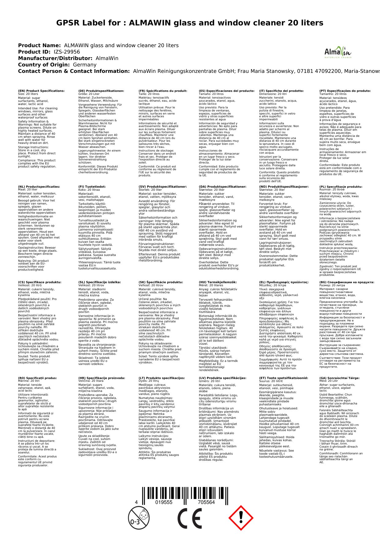 Glanadh Fuinneog 20 Lítear: Cumas mór atá iontach do ghnólachtaí agus tithe móra. Oiriúnach chun fuinneoga, gloine agus dromchlaí tí a ghlanadh. Deartha le haghaidh úsáide gairmiúla agus tí. Foirmle nádúrtha a chinntíonn glanadh éifeachtach gan ceimiceáin chrua. Soláthraíonn sé bailchríoch gan smál, ag fágáil dromchlaí glan agus saor ó streaks.