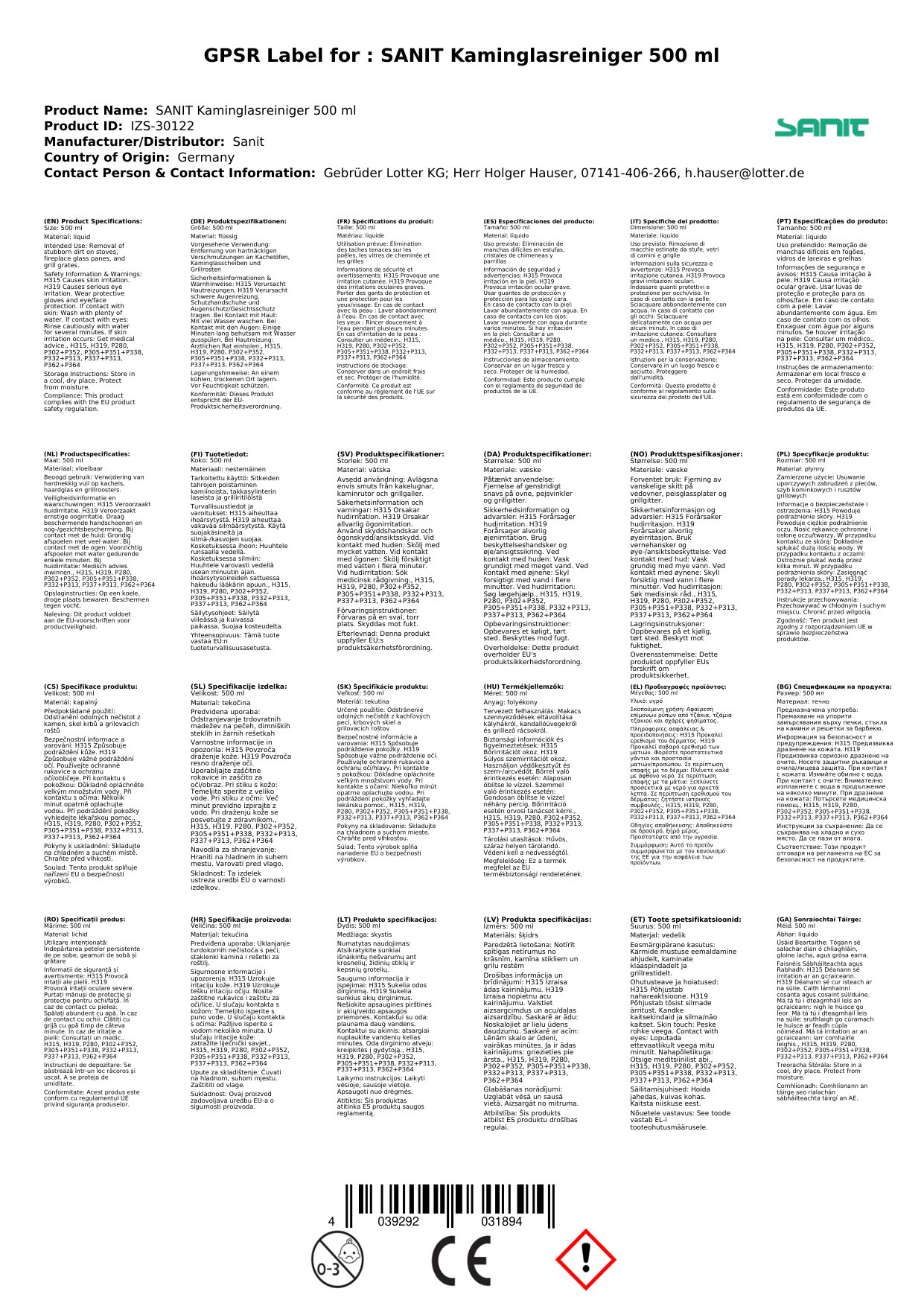 - P305/351/338 – I gcás teagmhála leis na súile: Sruthlaigh go réidh le huisce ar feadh cúpla nóiméad. Bain lionsaí tadhaill, má tá siad ann agus éasca a dhéanamh. Lean ort ag sruthlú.