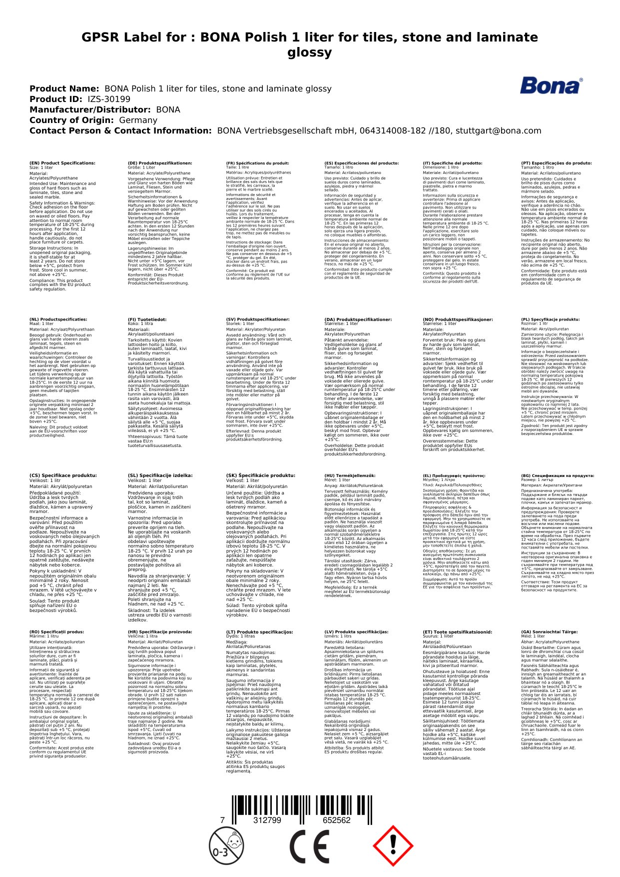 Cuir ceist chun níos mó a fhoghlaim faoin táirgeSnas Bona, Snas Tíleanna, Snas Cloiche, Snas Lamináit, Snas urláir 1 Lítear, Snas Gloineach