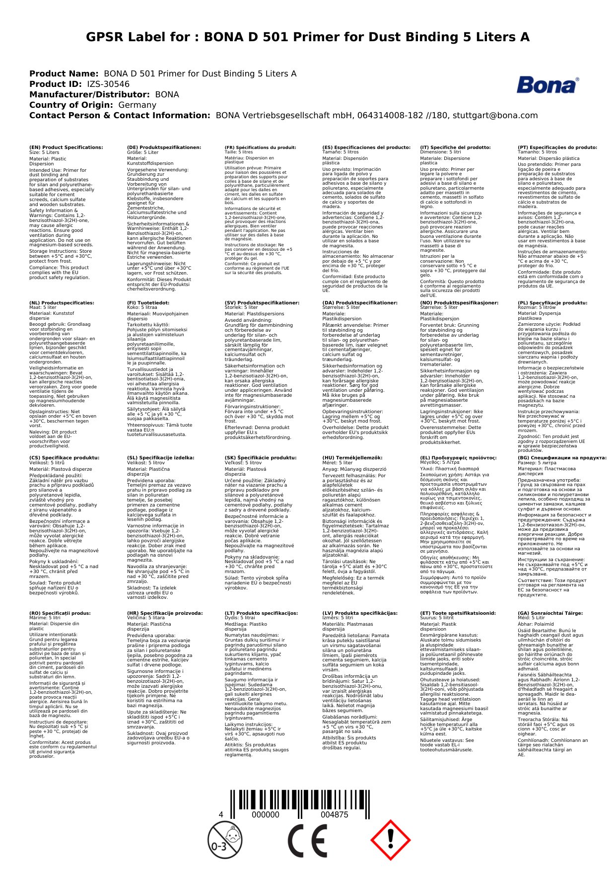Cuir ceist chun níos mó a fhoghlaim faoin táirgePrimer D 501 Bona, 5 lítear, Grundierung, Staubbindung