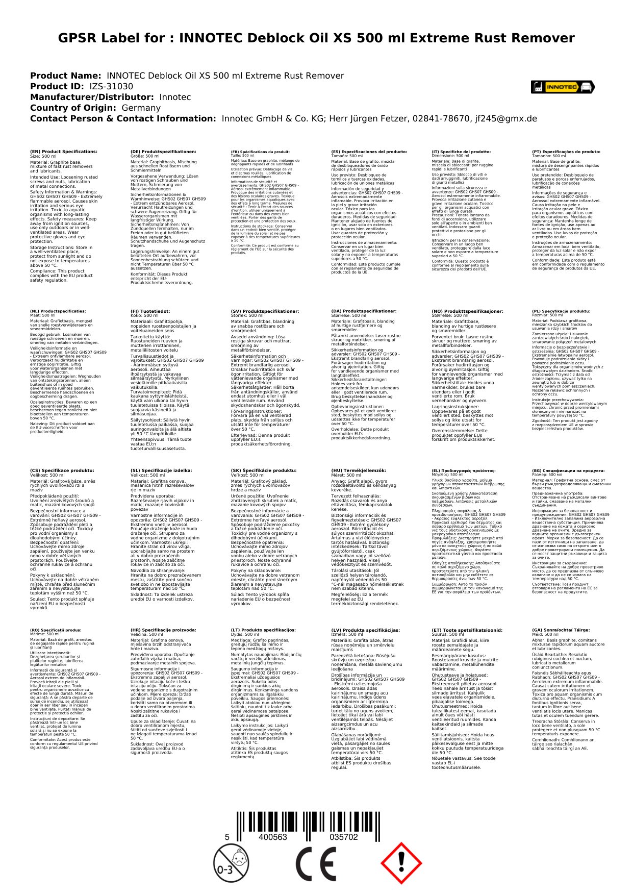 Tá an ola díbhlocála seo deartha chun meirge a ghlanadh agus páirteanna greamaithe a scaoileadh go héifeachtach. Leis an fhoirmle treáite, sroicheann sí na spásanna is deacra chun an fhadhb a réiteach. Tá an spraeire meirge seo éasca le húsáid agus tagann sé i mbuidéal 500ml. Sin an fáth gur uirlis riachtanach í d'aon duine atá ag obair le meaisíní nó le trealamh.