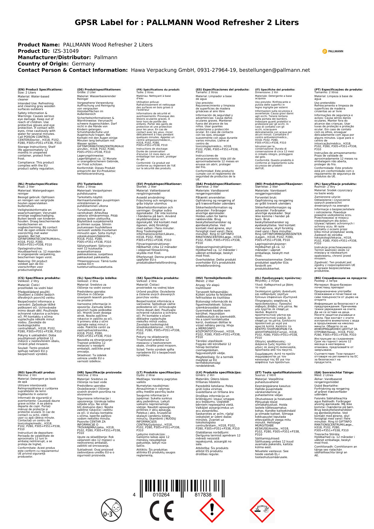 DANGER: Aicmiú de réir VO 1272/2008: H302 – Díobhálach má shlogtar. H318 – Is cúis le damáiste tromchúiseach súl.