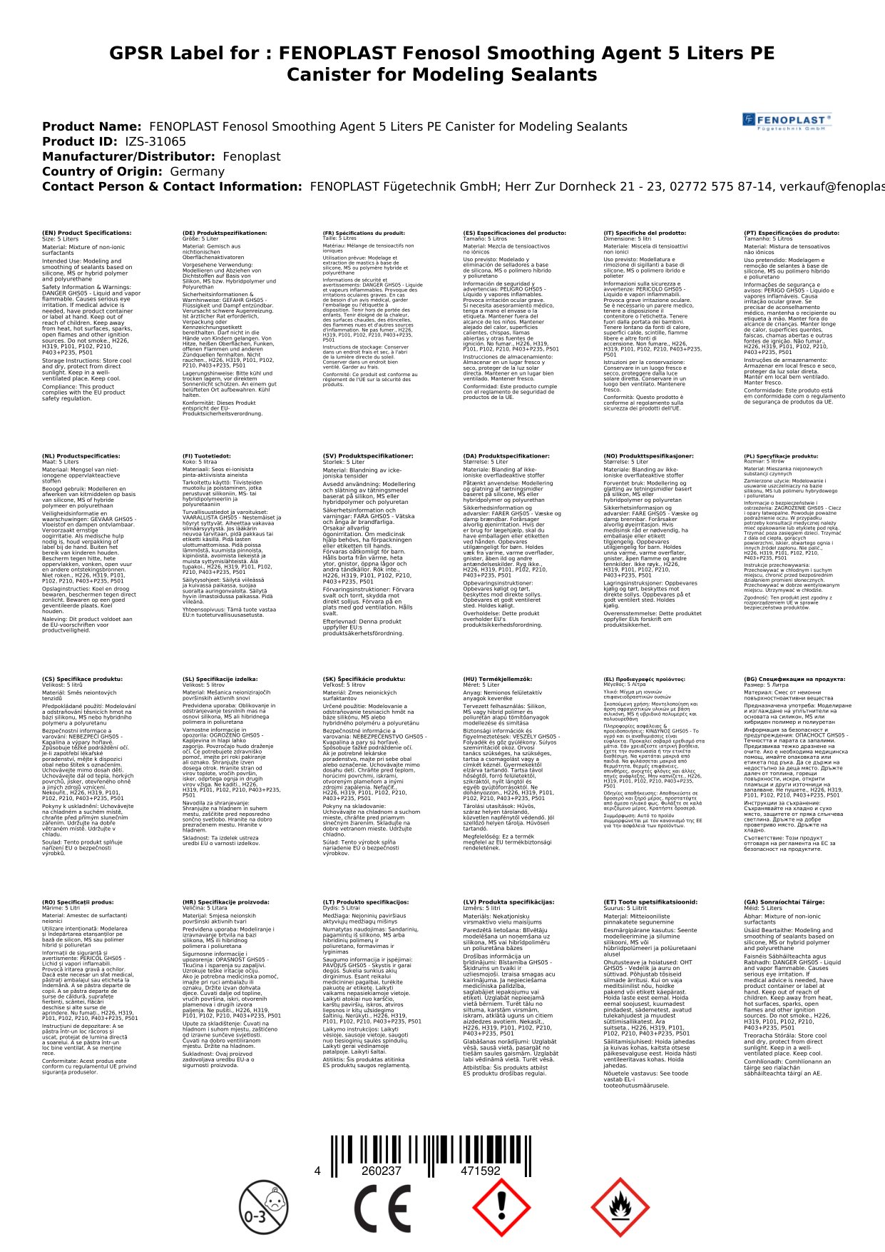 Cuir ceist chun níos mó a fhoghlaim faoin táirgeGlanadh Dromchlaí, Ábhar Glantacháin, Fenosol Glättmittel, 5 L PE-Kanister