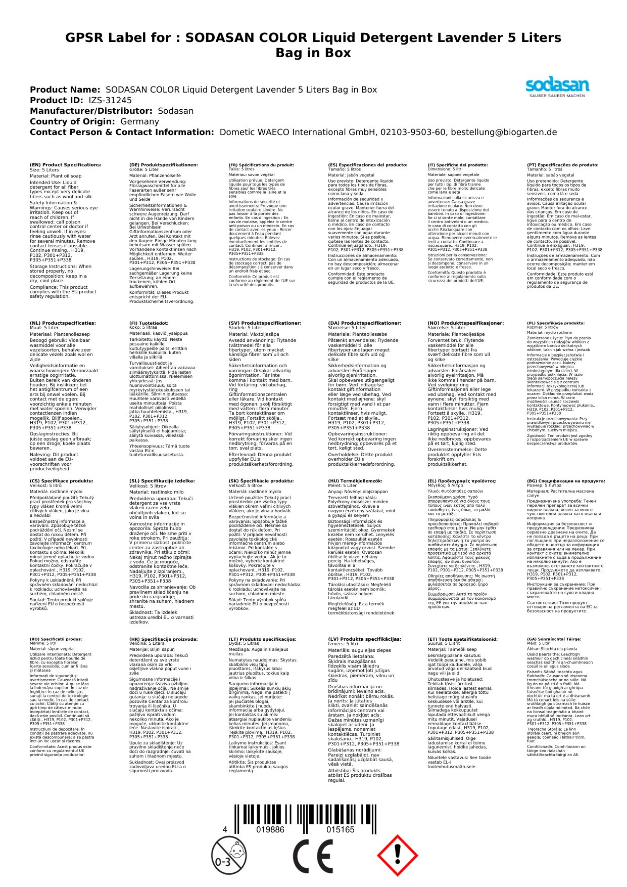 Tá an Glanadh dathanna leachtach lavender seo foirfe do gach níochán. Tá sé bunaithe ar chomhábhair nádúrtha agus tá sé an-éifeachtach. Cuidíonn an pacáistiú 5 L Bag-in-Box leat an timpeallacht a chosaint agus airgead a shábháil. Is féidir leat a bheith cinnte go bhfuil tú ag úsáid táirge atá sábháilte do do theaghlach agus don timpeallacht.