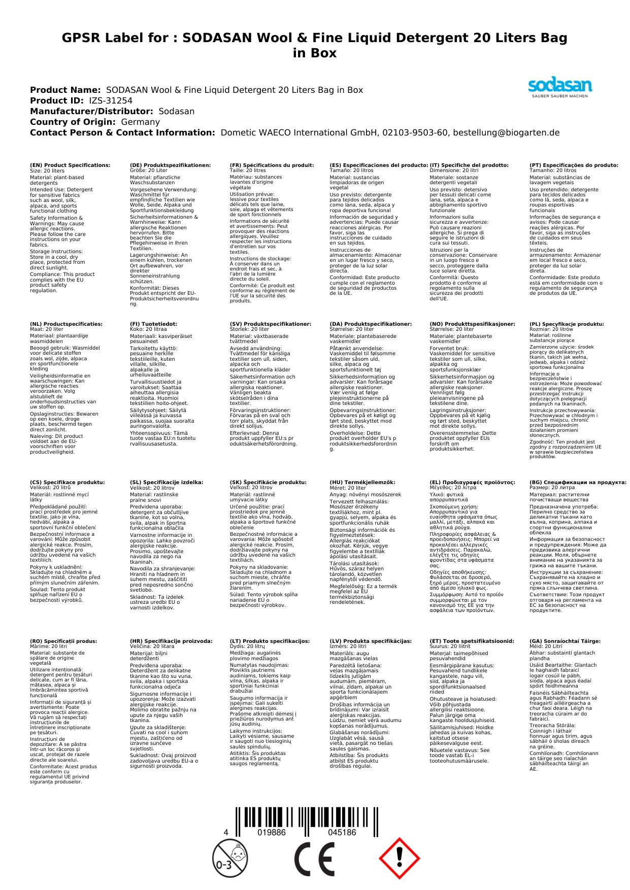 Tá ár leacht níocháin olann deartha chun aire a thabhairt do do chuid éadaí is íogaire. Le toirt de 20 lítear, cuireann sé réiteach fadtéarmach ar fáil do do riachtanais níocháin. Tá sé foirfe chun olann, éadaí mín, agus fabraicí íogaire eile a níochán, ag cinntiú go bhfanann siad bog agus i riocht den scoth. Tá an táirge seo iontach dóibh siúd atá ag lorg rogha nádúrtha agus éifeachtach le haghaidh cúram éadaí.