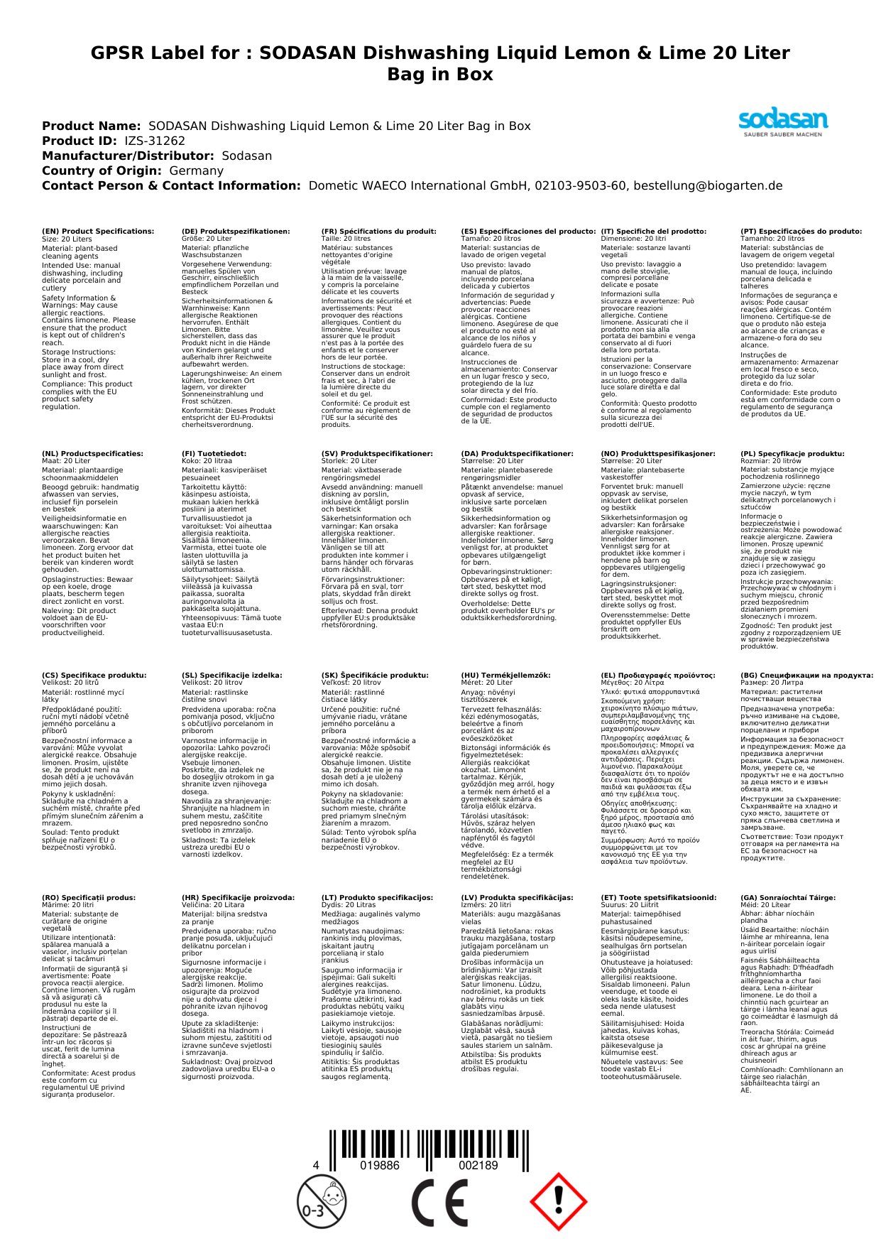 Cuir ceist chun níos mó a fhoghlaim faoin táirgeGlanadh mias Lemon & Lime 20 lítear, Gallúnach mias, Leacht níocháin mias
