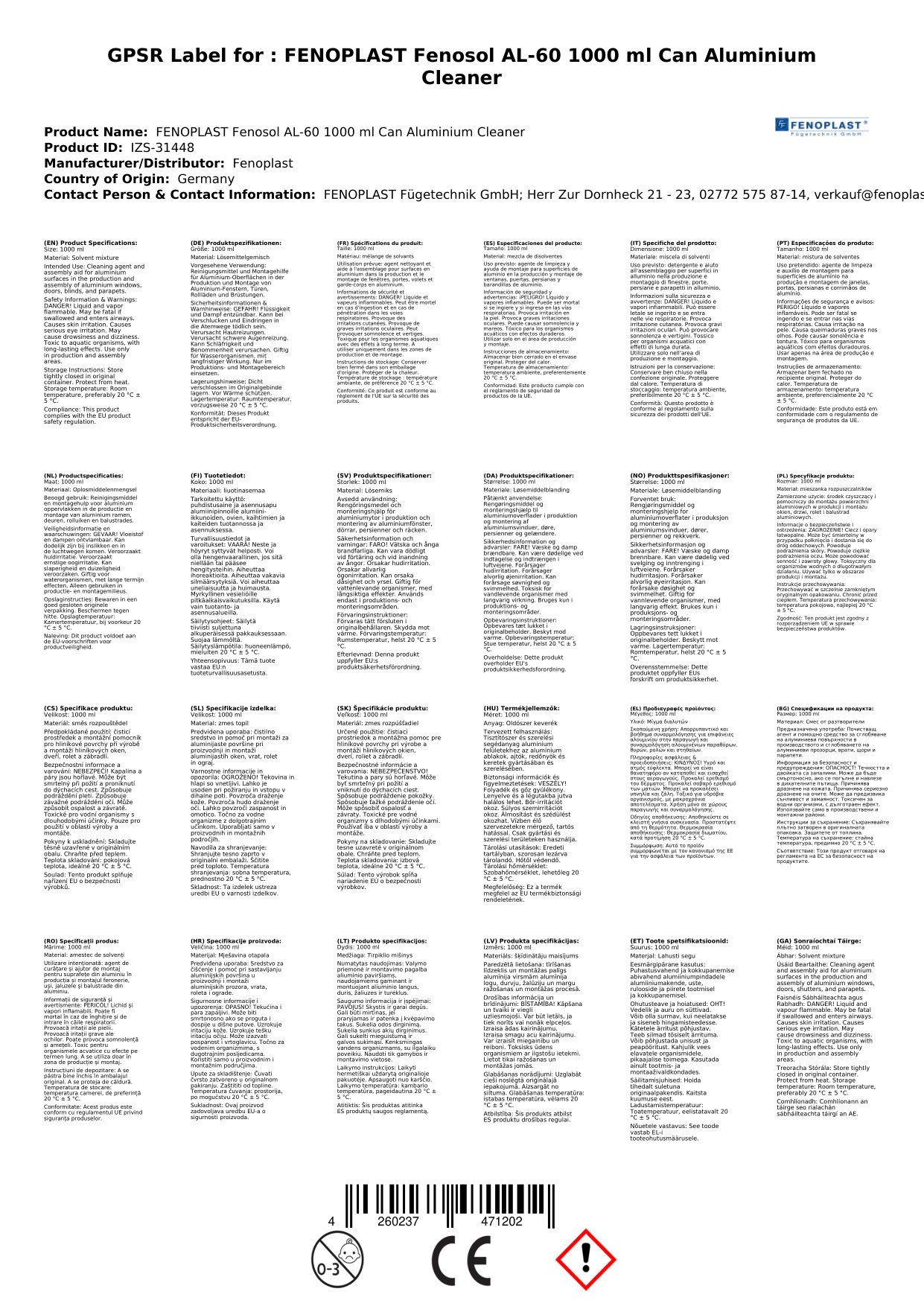 Is glantóir alúmanaim proifisiúnta é Fenosol AL-60 atá deartha chun miotail a ghlanadh go héifeachtach. Tá sé ar fáil i ndáileog 1000 ml. Tá sé foirfe chun dromchlaí alúmanaim a athchóiriú agus a chosaint. Tá an glantóir seo éifeachtach chun deireadh a chur le héagsúlacht salachar agus grime.