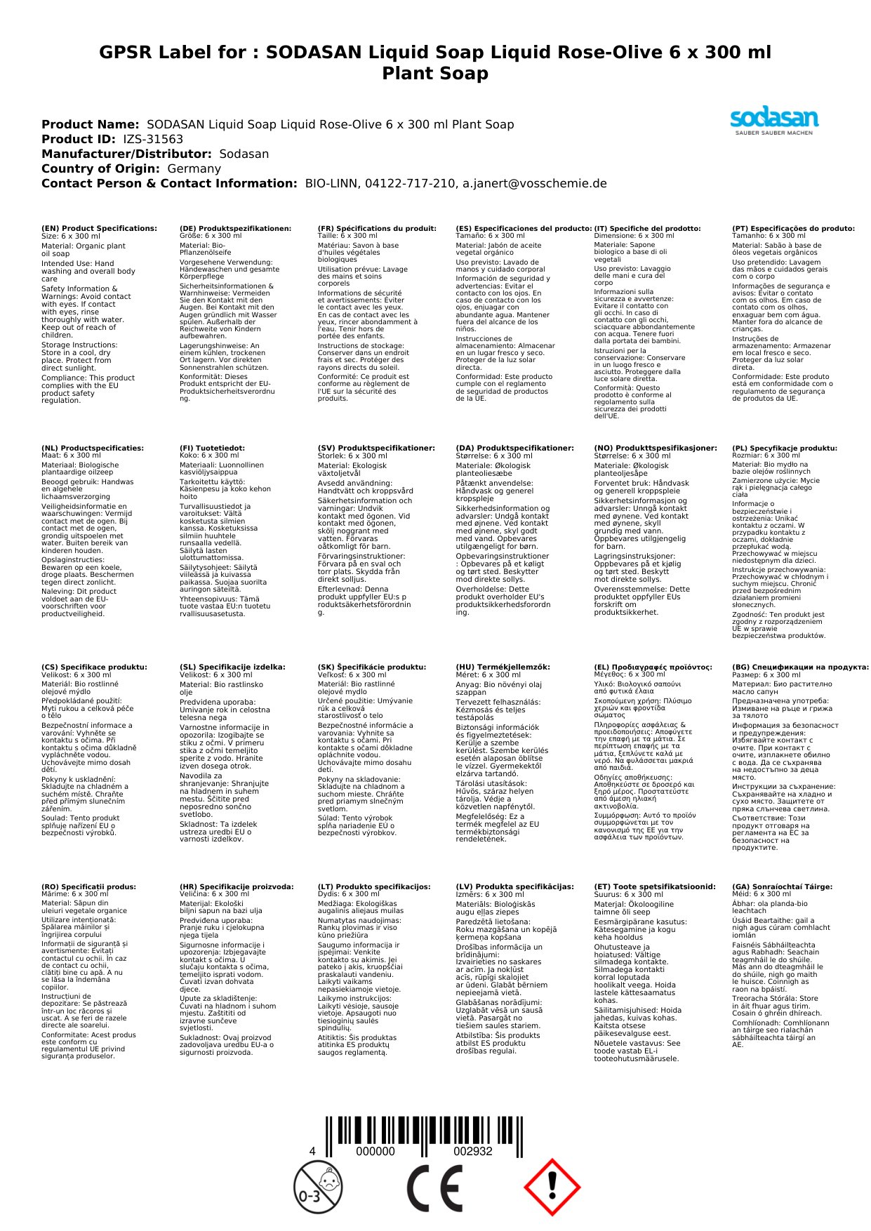 Is gallúnach leachtach é seo atá bunaithe ar phlandaí, déanta le róis agus olóige, i bpacáiste de 6 x 300 ml. Tá sé nádúrtha, orgánach, agus foirfe le haghaidh níochán láimhe. Tá sé cairdiúil don chraiceann agus oiriúnach do gach cineál craicinn. Cén fáth a bhfuil sé tábhachtach duitse? Tá gallúnach sábháilte agus éifeachtach agat a chosnaíonn do lámha.