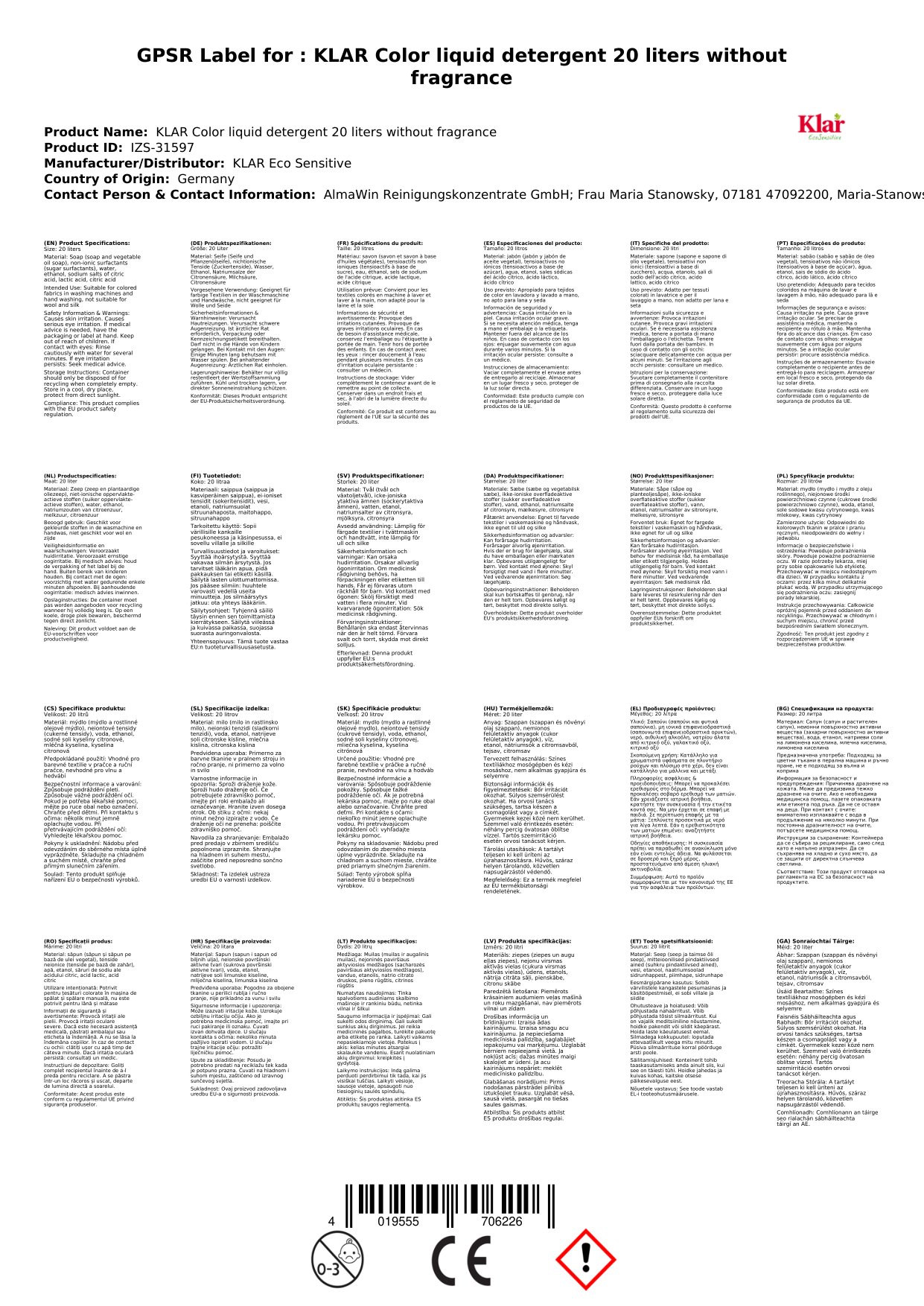 Tá ár nglantach níocháin dathanna leachtach deartha go speisialta chun do chuid éadaí dathanna a chosaint agus a ghlanadh go héifeachtach. Tá sé saor ó chumhrán, rud a fhágann go bhfuil sé oiriúnach do dhaoine le craiceann íogair nó ailléirgí. Leis an méid 20 lítear, gheobhaidh tú soláthar fada buan. Cén fáth go bhfuil sé seo tábhachtach duit: Cinntíonn tú níocháin éifeachtach agus cosanta ar feadh tréimhse fada, gan dochar a dhéanamh do do chraiceann nó don chomhshaol.