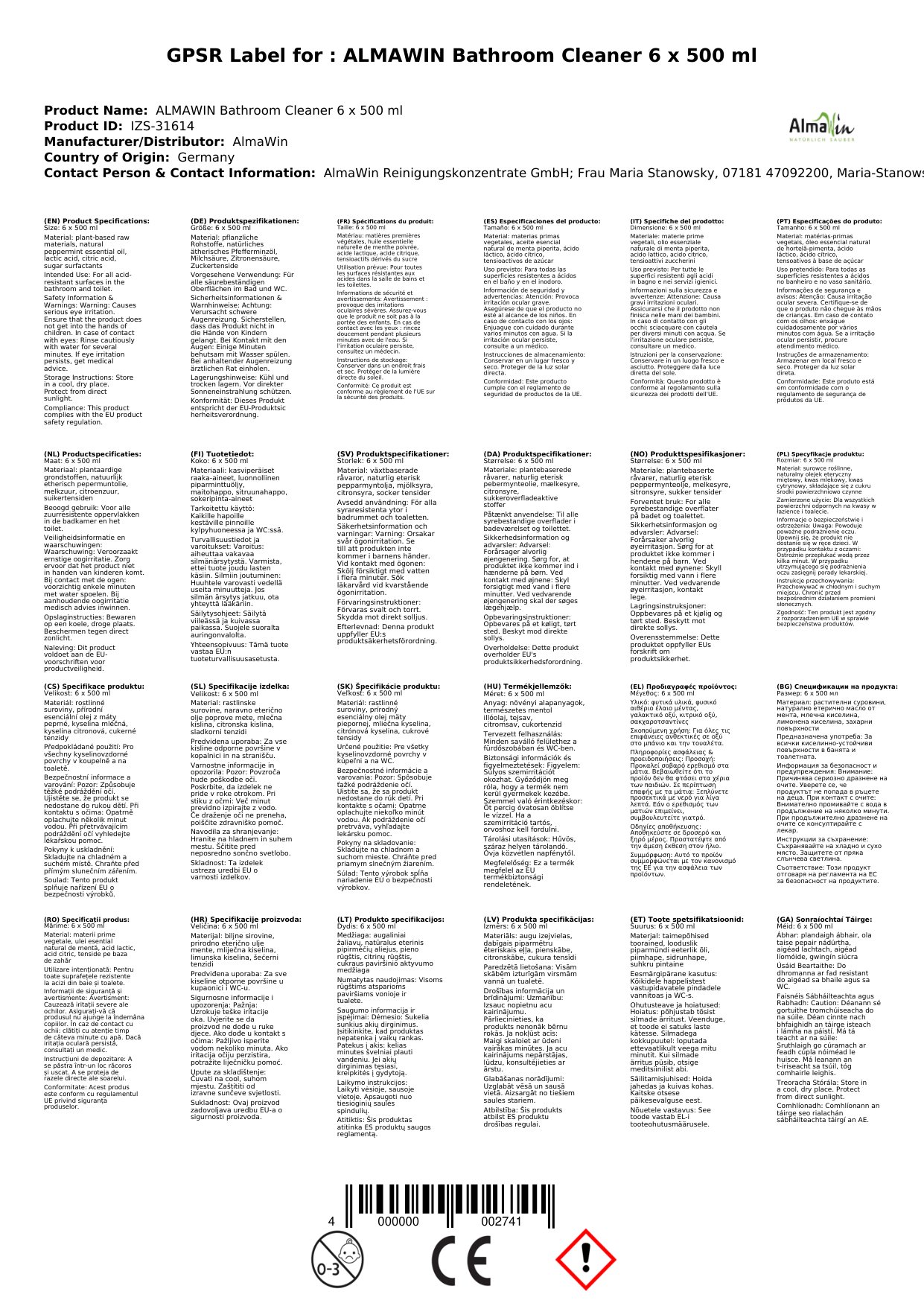 Cuir ceist chun níos mó a fhoghlaim faoin táirgeGlanadh seomra folctha, Glanadh folctha, Glanadh seomra folctha nádúrtha, 6 x 500 ml