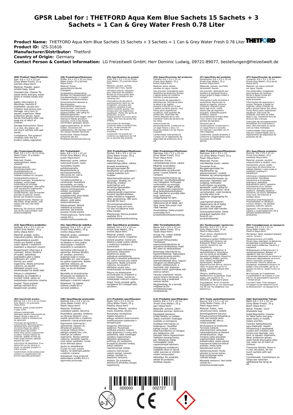 Sachet Glantacháin Leithris, Glanadh Uisce Liath, Sachet Leithris iniompartha, Grey Water Fresh 0,78 Liter
