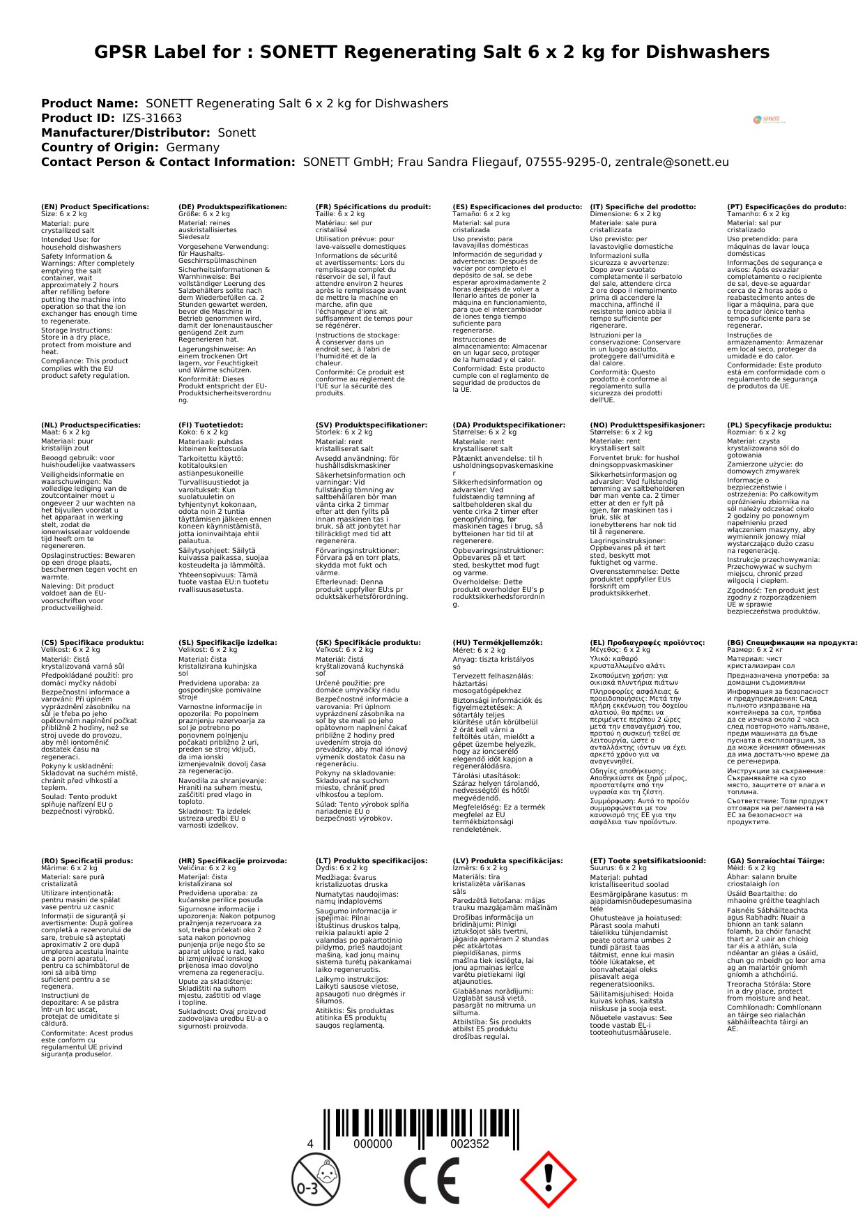 An bhfuil tú ag streachailt le huisce crua agus spotaí ar do chuid earraí gloine? Cuireann ár salann athghiniúna miasniteoir ar ardchaighdeán réiteach simplí agus éifeachtach ar fáil. Cuidíonn an salann speisialta seo le do mhiasniteoir a choimeád ag feidhmiú go héifeachtach, ag cosaint do mhiasa agus ag cinntiú go mbeidh siad glan agus lonrach gach uair. Le pacáiste áisiúil de 6 x 2kg, beidh soláthar fada agat chun fadhbanna uisce crua a chomhrac. Faigh réidh le huisce crua agus bain sult as miasa glana gan smál!