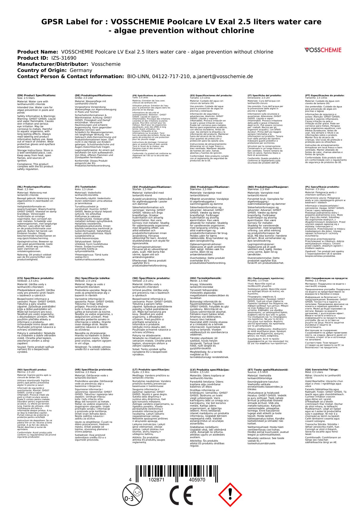 Tairgeann an táirge cúram uisce linn snámha seo cosc algaí gan clóirín. Tá sé éifeachtach i gcoinne fás algaí agus coinníonn sé uisce do linn snámha glan. Tá an táirge ar fáil i méid 2.5L, atá oiriúnach chun linnte snámha a chóireáil go rialta. Cén fáth go bhfuil sé seo tábhachtach duit: Cinnteoidh tú go mbaineann tú sult as linn snámha sábháilte agus sláintiúil gan na fo-iarsmaí a bhaineann le clóirín.