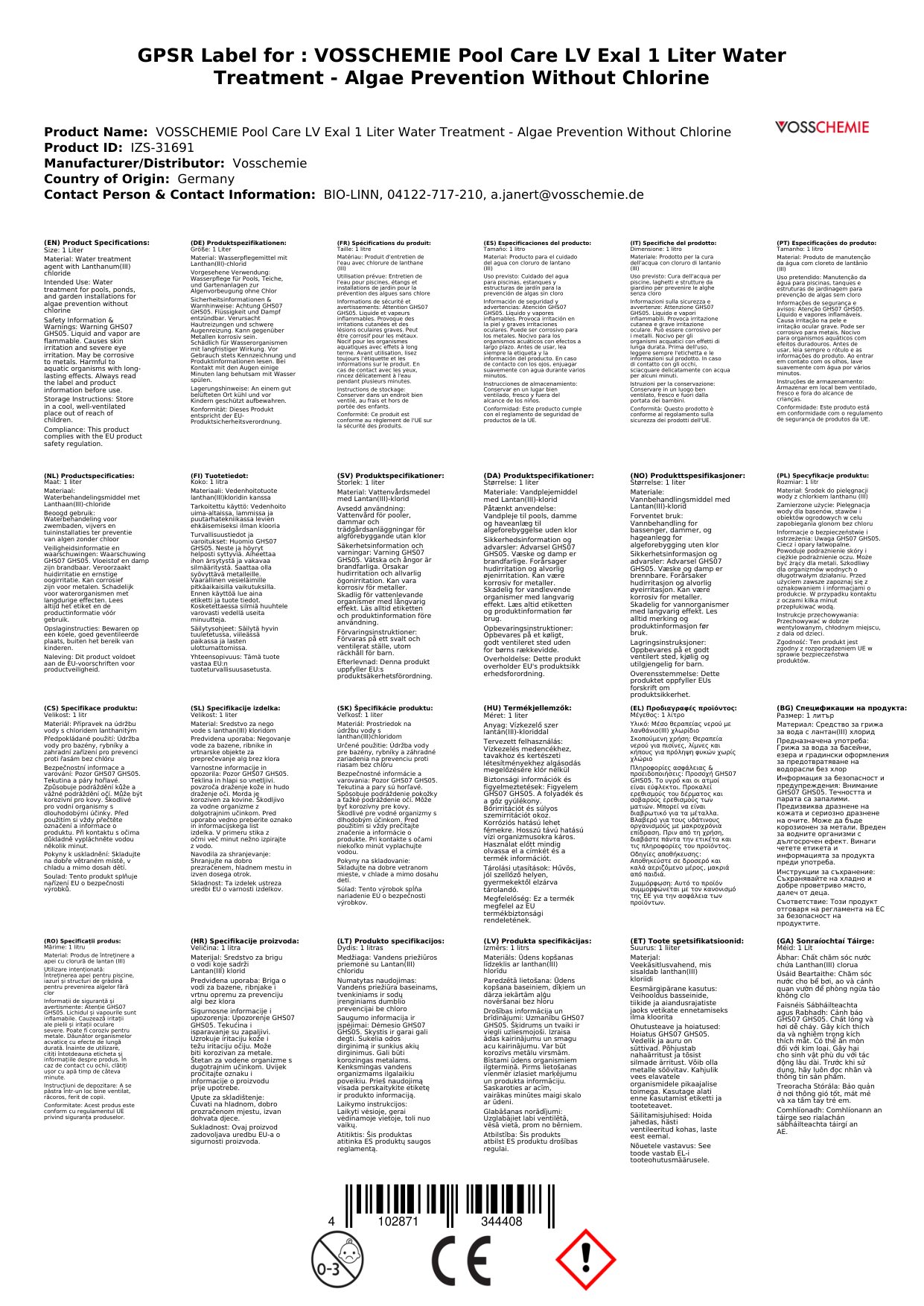 Is táirge cúraim uisce linn snámha é LV-Exal ón mbranda Vosschemie atá deartha chun cosc a chur ar algaí gan clóirín a úsáid. Tá an táirge seo ar fáil i mbuidéal 1 lítear, atá áisiúil agus éasca le húsáid. Cuidíonn an táirge seo le huisce do linne a choinneáil glan agus soiléir, rud a chinntíonn timpeallacht shnámha shábháilte agus taitneamhach duitse agus do do theaghlach.