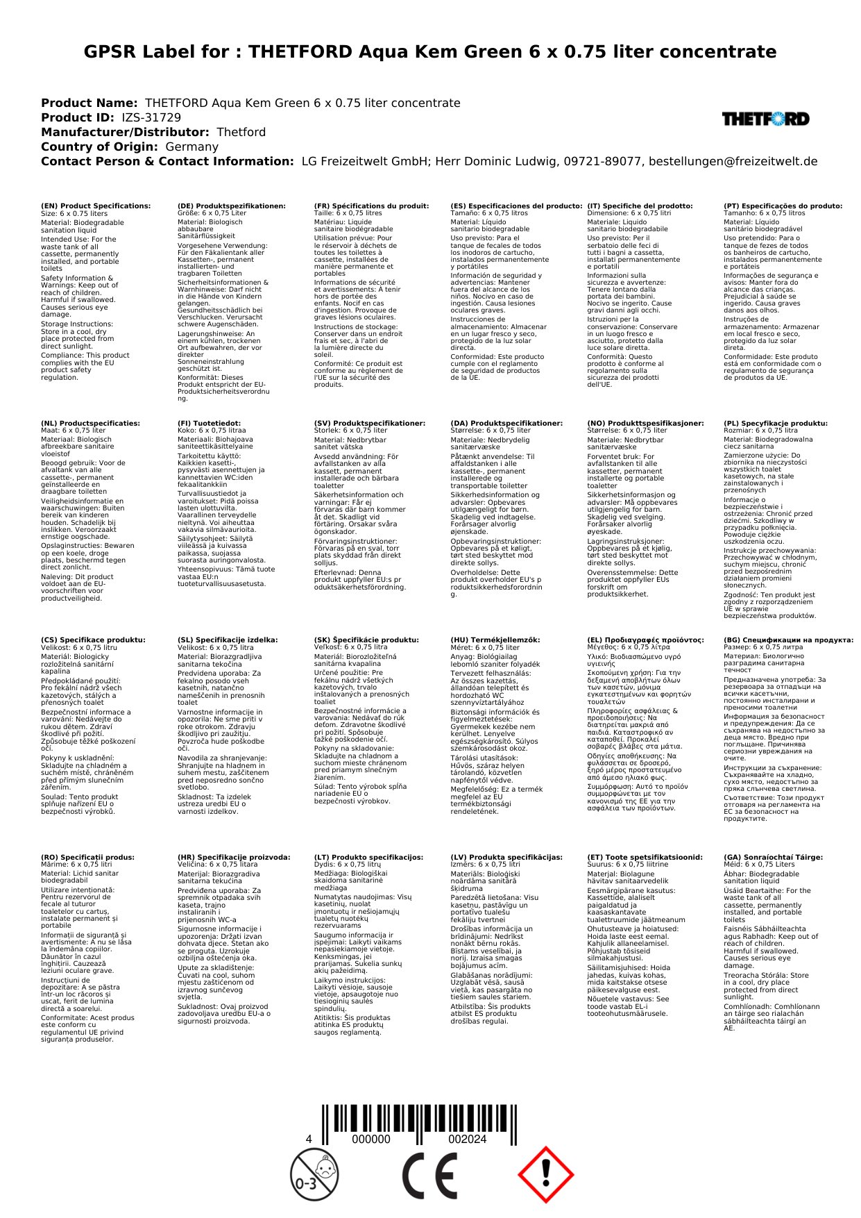 Cuir ceist chun níos mó a fhoghlaim faoin táirgeLeacht le haghaidh leithris iniompartha, 6 x 0,75 Liter, Konzentrat le haghaidh leithris, Leacht glas le haghaidh leithris