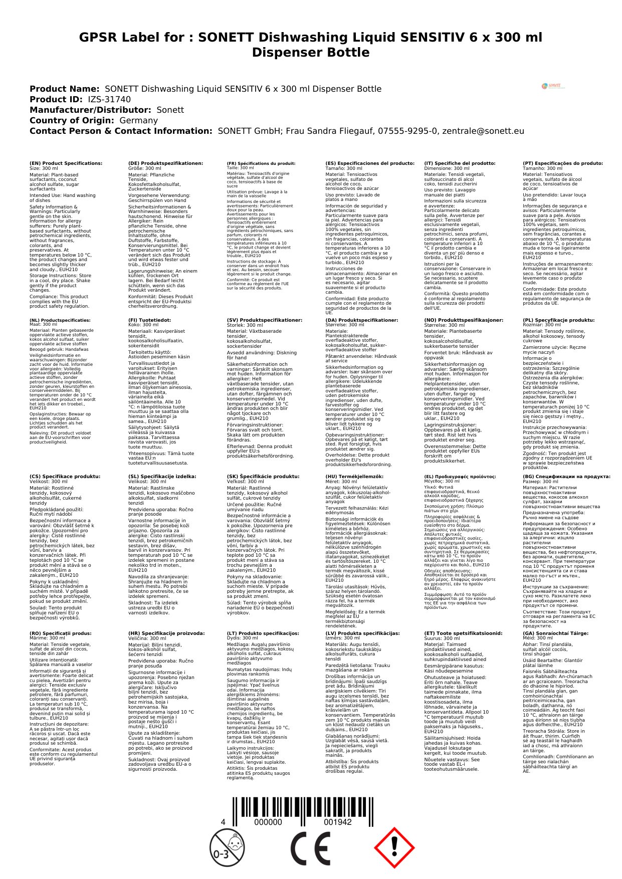 Tá ár gallúnach miasniteoir íogair deartha chun cúram a thabhairt do do lámha agus do na miasa araon. Tá sé saor ó ruaimeanna, cumhráin, agus leasaithigh. Tá an pacáiste seo comhdhéanta de 6 buidéal, gach ceann acu le 300 ml de leacht miasniteoir. Cén fáth go bhfuil sé seo tábhachtach duit: is féidir leat miasa a ní go rialta gan a bheith buartha faoi greannú craicinn nó frithghníomhartha ailléirgeacha.