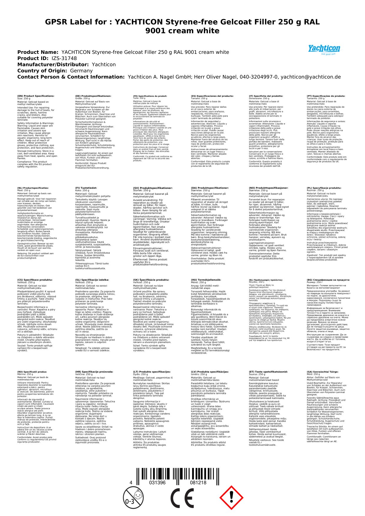 An bhfuil deisiúcháin bheaga gealchóta ag teastáil uait ar do bhád nó ar dhromchlaí eile? Tá ár Spachtóir Gealchóta, le dath RAL 9001 uachtar bán, foirfe chun damáiste a dheisiú agus bailchríoch ghairmiúil a bhaint amach. Tá an spachtóir seo stíreach-saor, rud a fhágann go bhfuil sé níos sábháilte le húsáid agus go dtugann sé toradh níos fearr. Leis an méid 250g, tá go leor agat chun roinnt deisiúchán a dhéanamh.