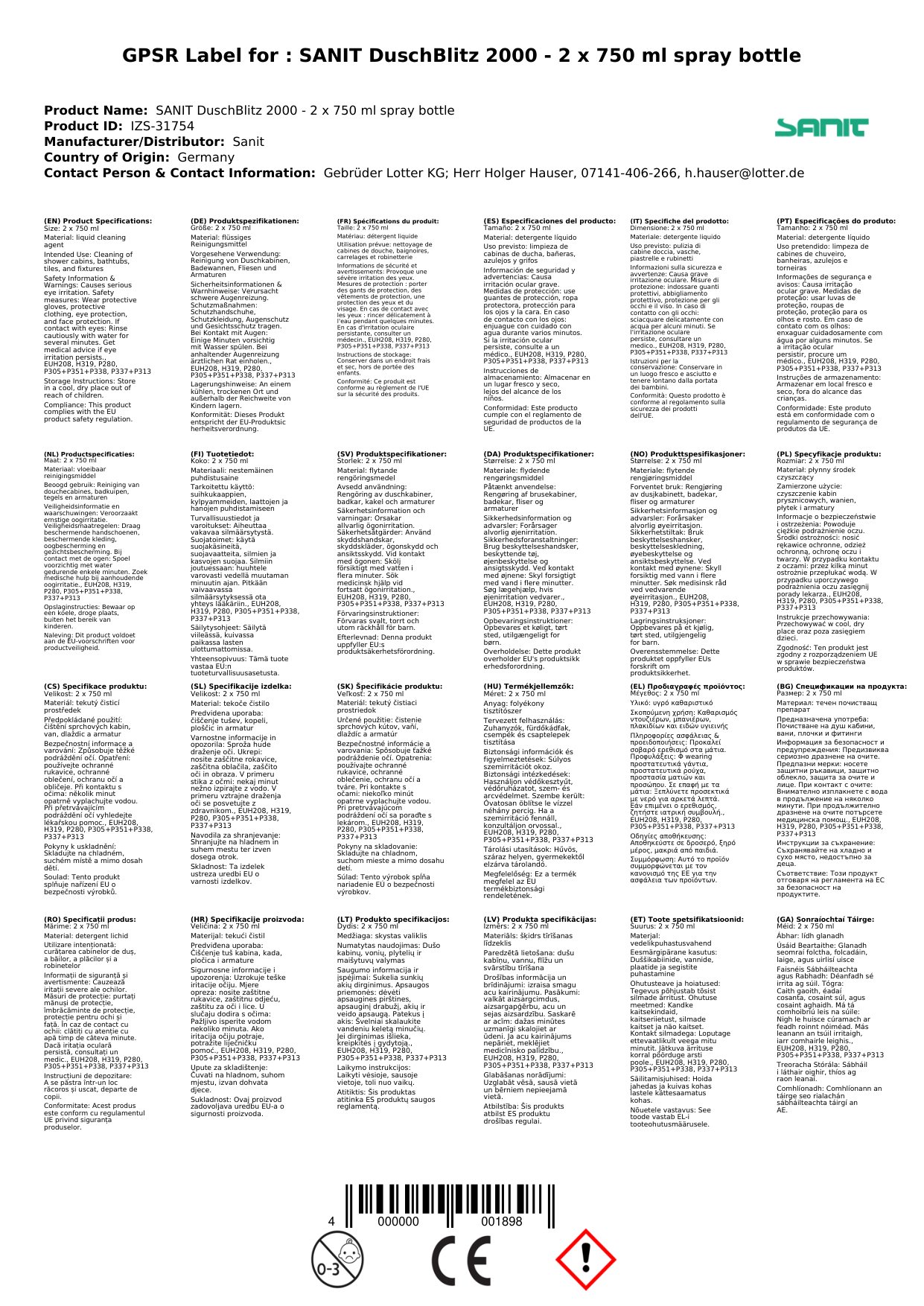Cuir ceist chun níos mó a fhoghlaim faoin táirgeGlanadh cithfholcadáin, Glanadh cith, Glanadh seomra folctha, 2 x 750 ml Sprüfflasche