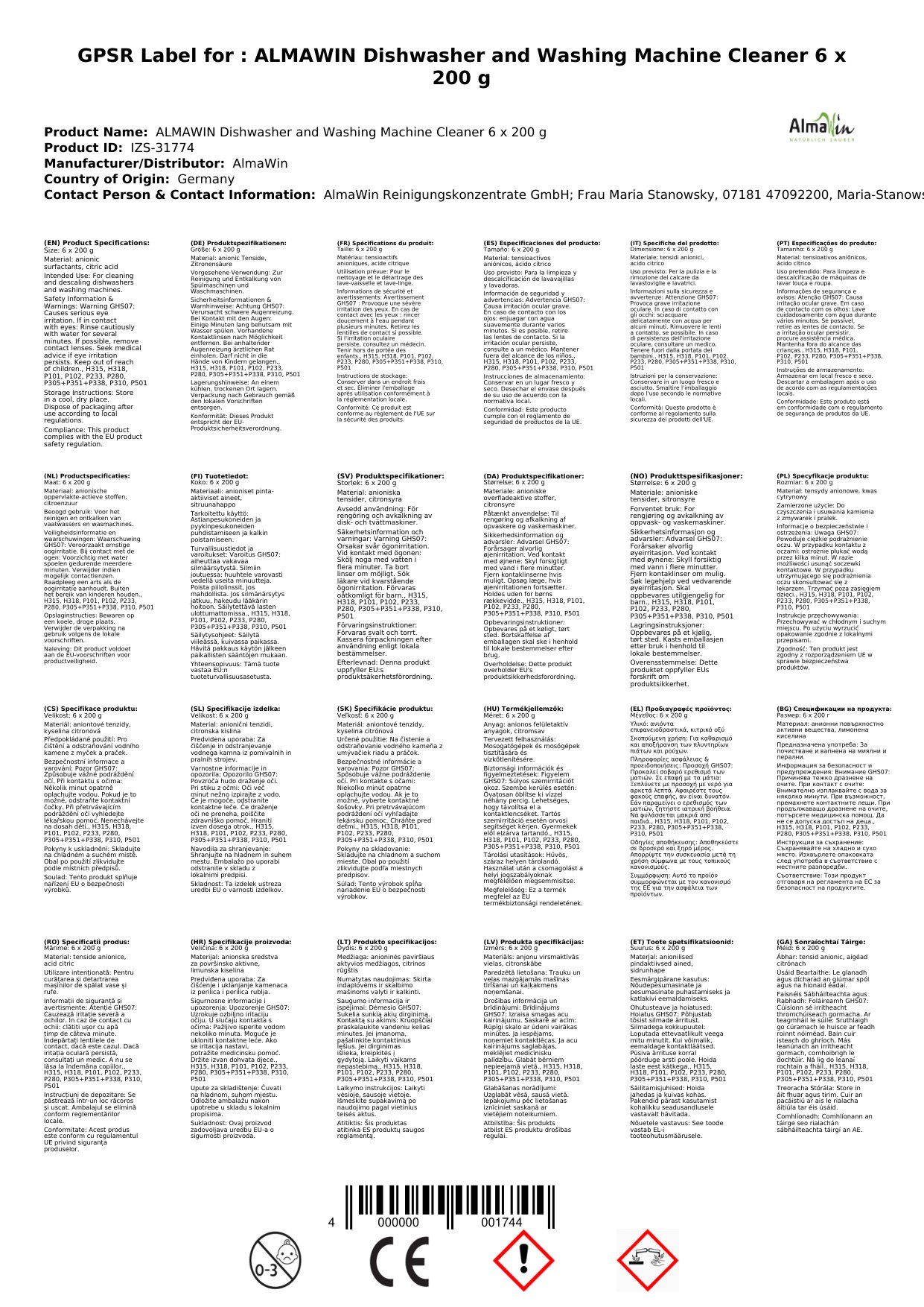 Tá ár nglantóir miasniteoir agus meaisín níocháin deartha chun do fhearais a choinneáil ag feidhmiú go héifeachtúil. Tá sé pacáistithe i bpacáistí áisiúla de 6 x 200 g, rud a chinntíonn go bhfuil soláthar fada agat. Tá an fhoirmle nádúrtha sábháilte do gach cineál miasniteoir agus meaisín níocháin, ag cinntiú nach ndéanann tú damáiste d'aon chomhpháirteanna inmheánacha. Úsáid é go rialta chun taiscí aoil agus salachar a chosc, ag leathnú saol do fhearais. Is rogha iontach é má tá tú ag lorg bealach éasca agus éifeachtach chun cúram a thabhairt do do fhearais.