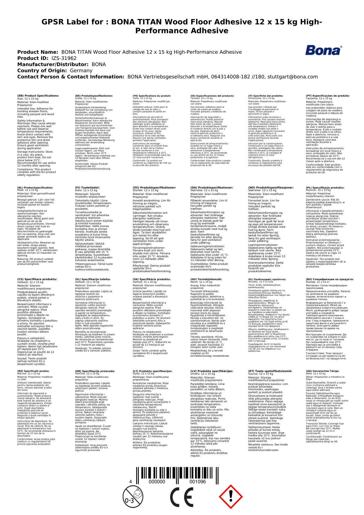 Gliú páircéad, BONA TITAN, Gliú ard-fheidhmíochta, 12 x 15 kg