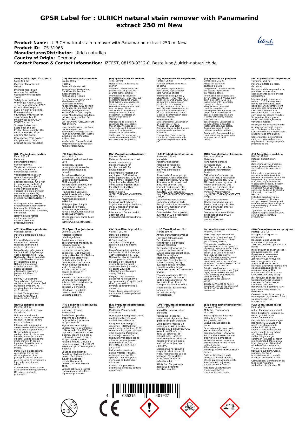 Cuir ceist chun níos mó a fhoghlaim faoin táirgeGlanadh stain le Panamarindenextrakt, Glanadh nádúrtha, 250 ml