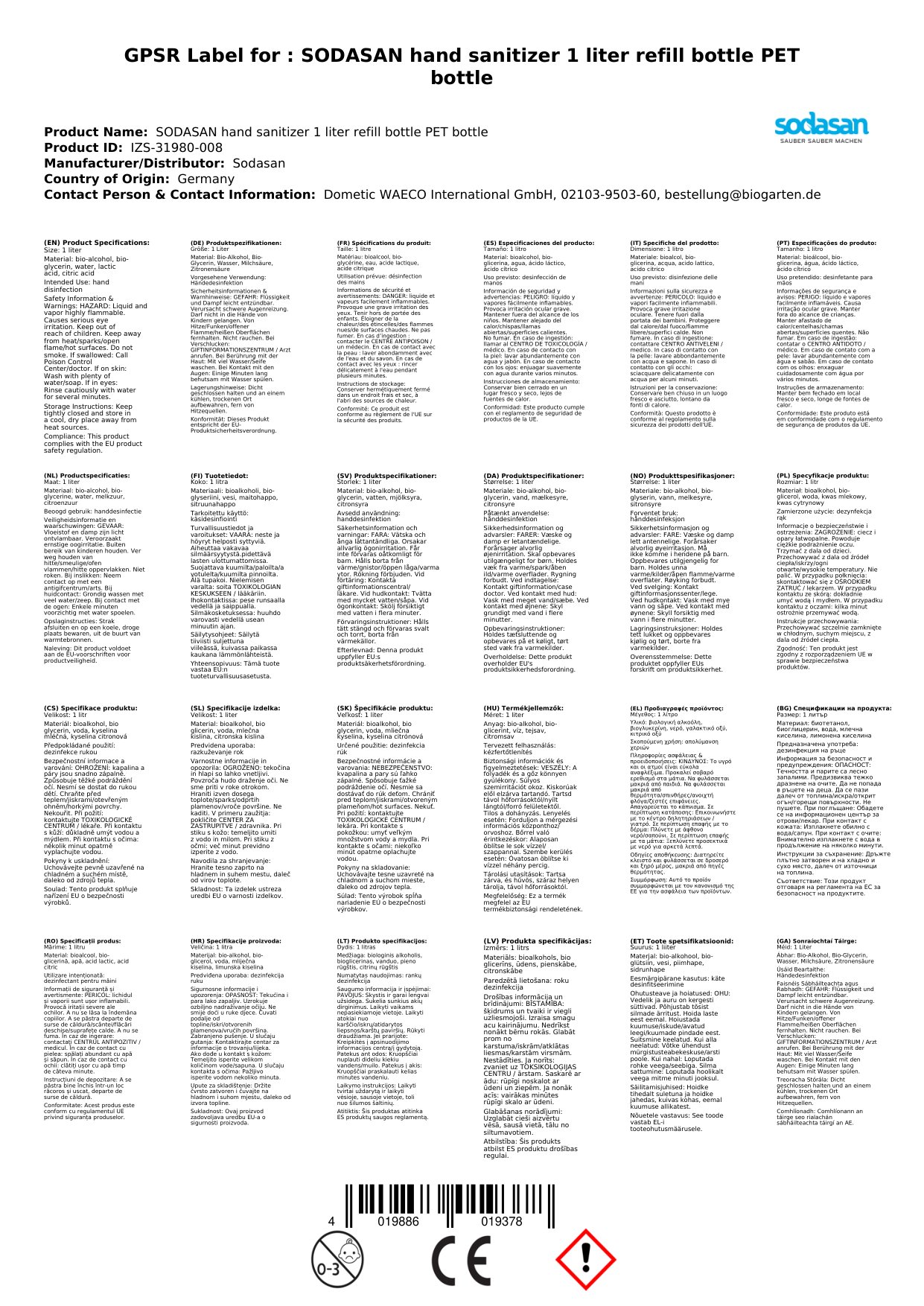 Is éard atá inár ndíghalrán láimhe buidéal athlíonta PET 1 lítear, atá deartha chun dramhaíl a laghdú. Tá an fhoirmle bunaithe ar alcól, a chinntíonn díghalrú éifeachtach. Tá sé oiriúnach le húsáid go minic agus cabhraíonn sé leat do lámha a choinneáil glan agus saor ó bhaictéir. Tá sé seo tábhachtach duit mar is féidir leat timpeallacht níos sláintiúla a chruthú do tú féin agus do dhaoine eile.