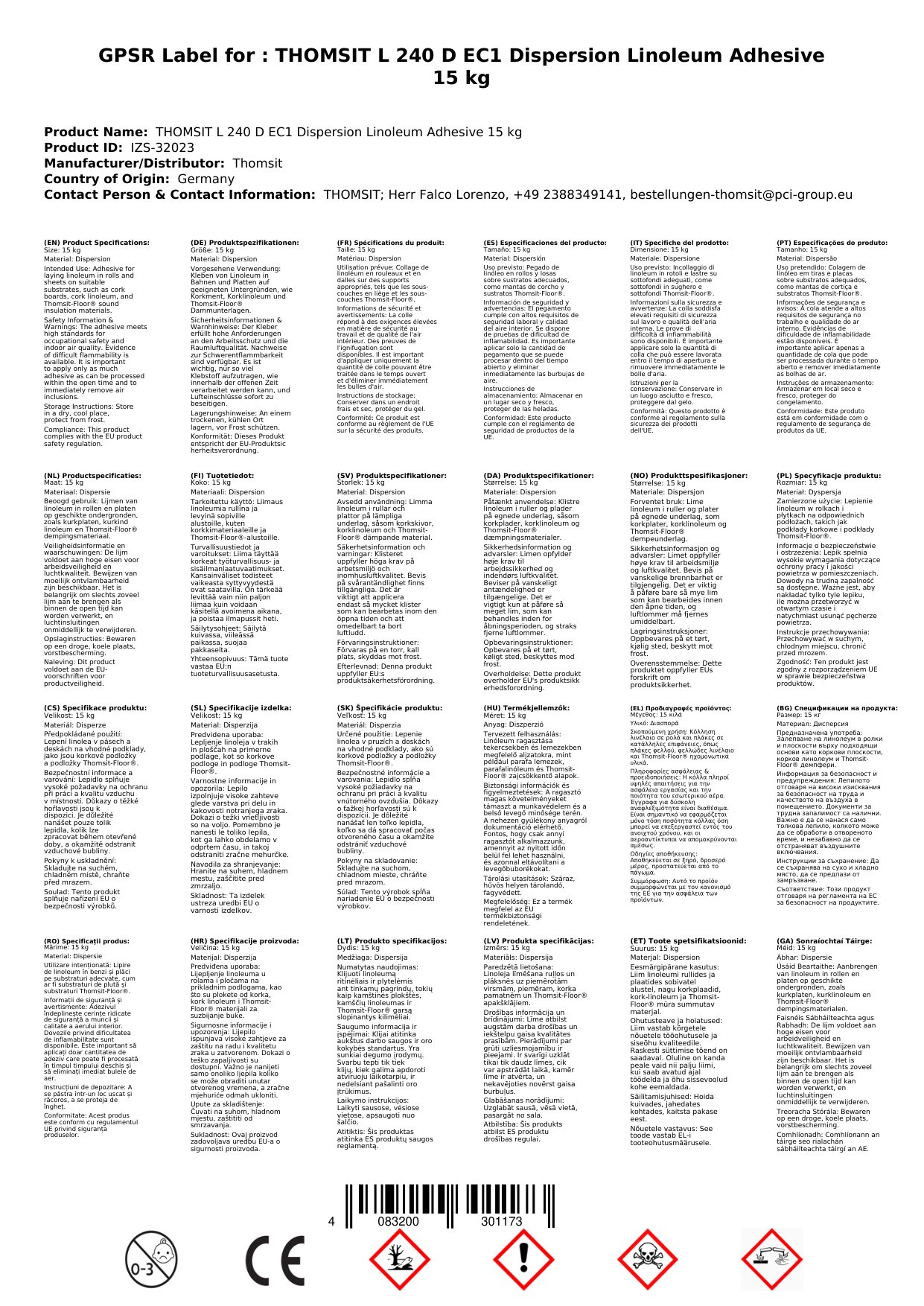 Cuir ceist chun níos mó a fhoghlaim faoin táirgeGliú linóleum, Greamachán linóleum, Thomsit L 240 D EC1, 15 kg