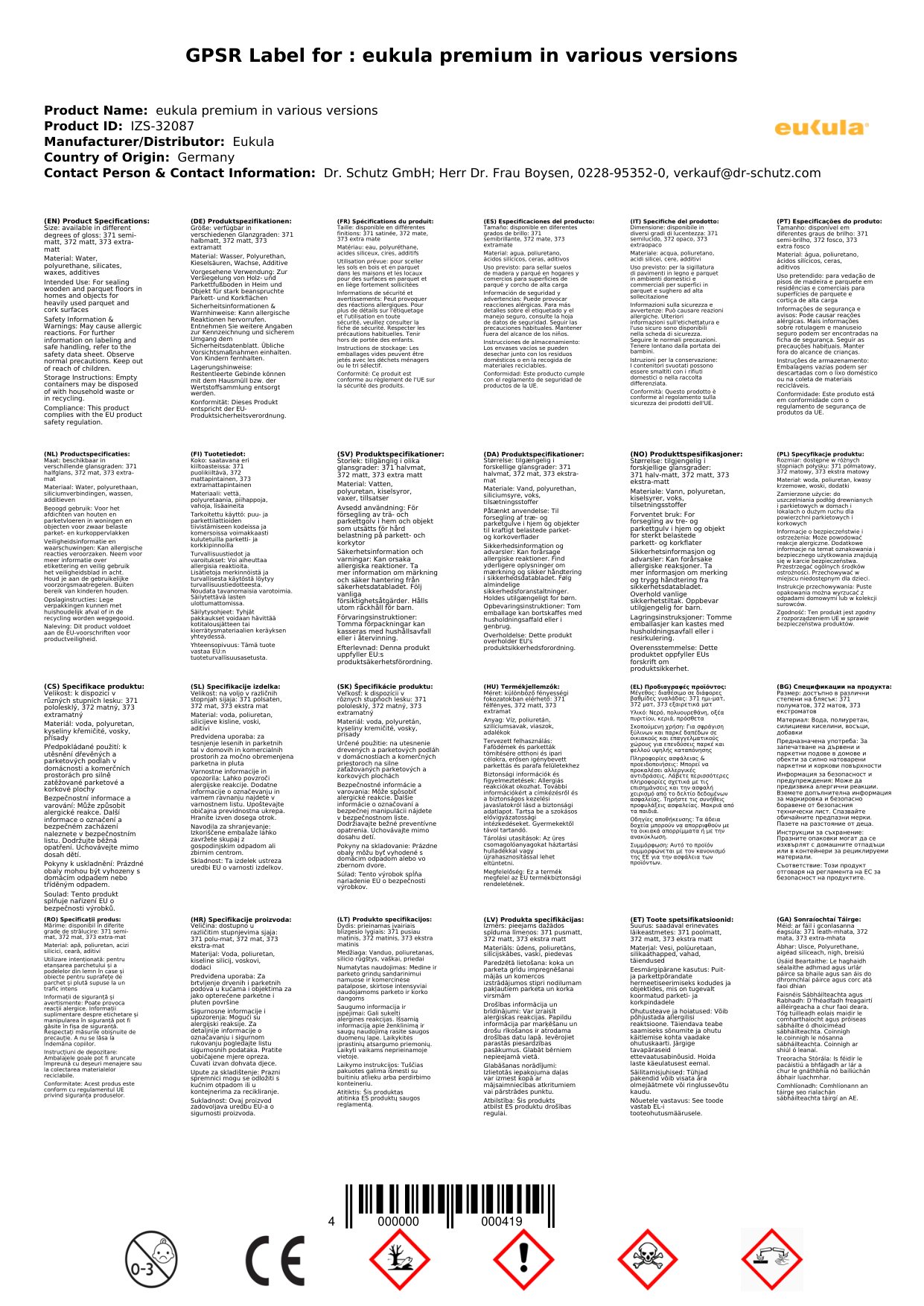 Contúirt: Aicmiú de réir VO 1272/2008: H302 - Díobhálach má shlogtar. H318 - Déanann sé damáiste tromchúiseach do na súile.